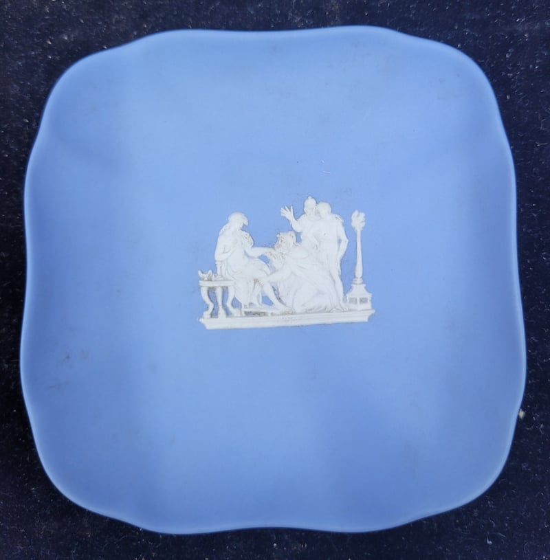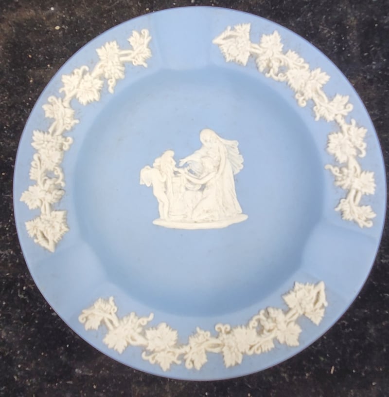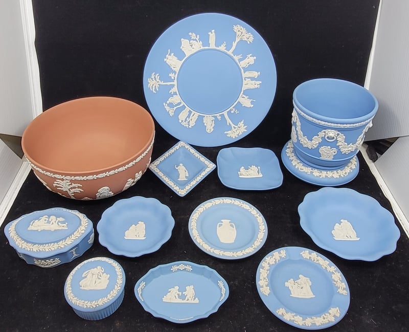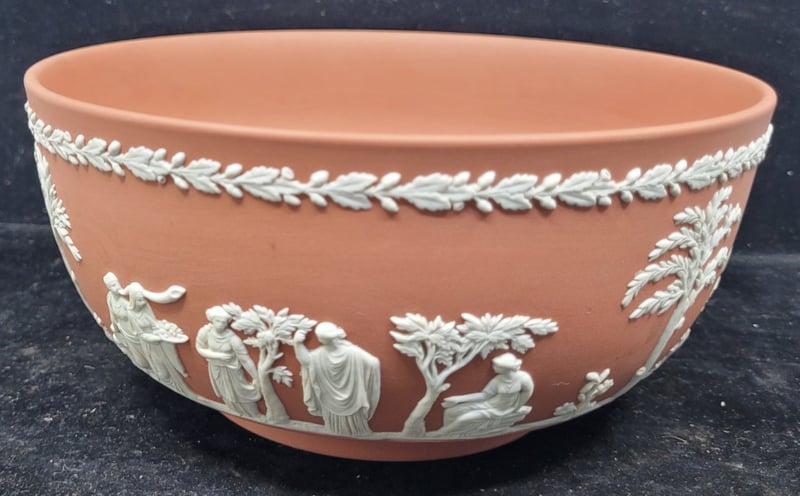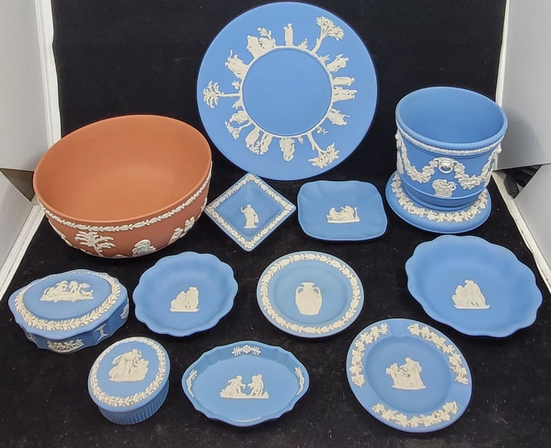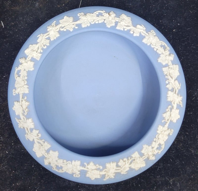 COLLECTION OF WEDGWOOD JASPERWARE POTTERY PIECESIncludes Various Items:Plates, Dishes, Vase And Trinket Boxes In Iconic Blue Color With White Cameos.Orange-Red BowlCondition: Good - Refer To Images582910+11