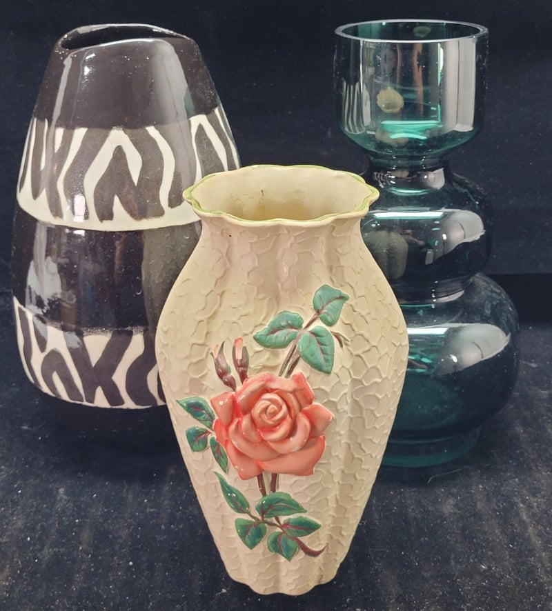 CERAMIC AND GLASS VASE COLLECTION WITH ZEBRA PATTERN AND FLORAL MOTIFS