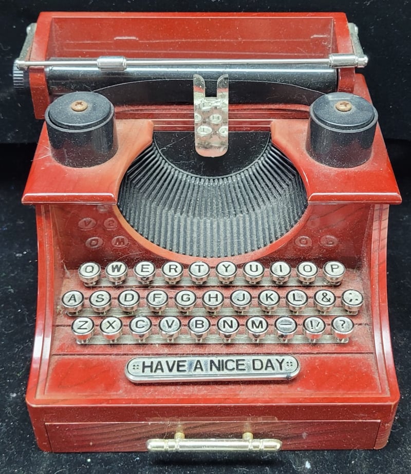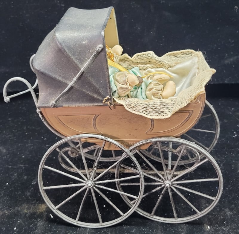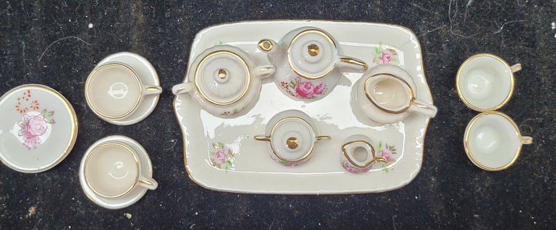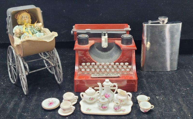 MINIATURE DOLL TEA SET, FLASK, TOY PRAM AND TYPEWRITER