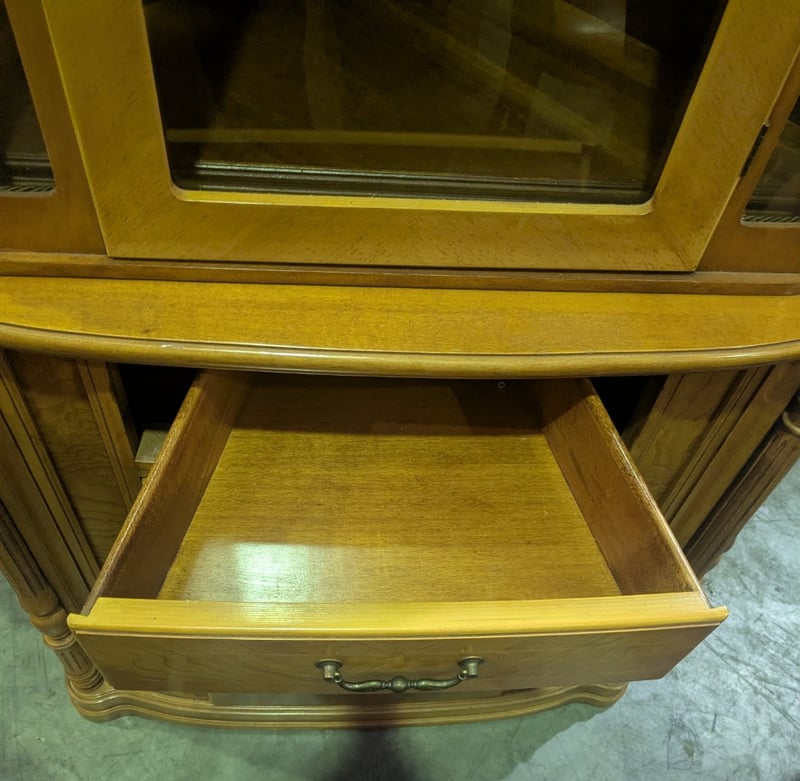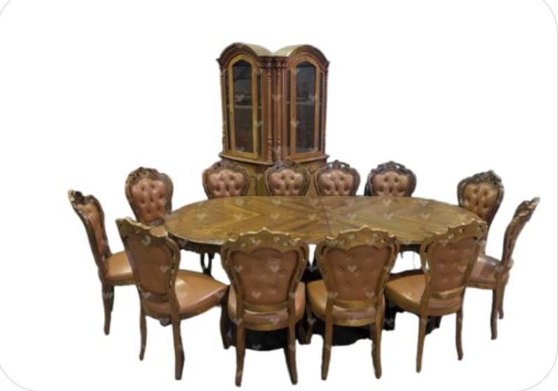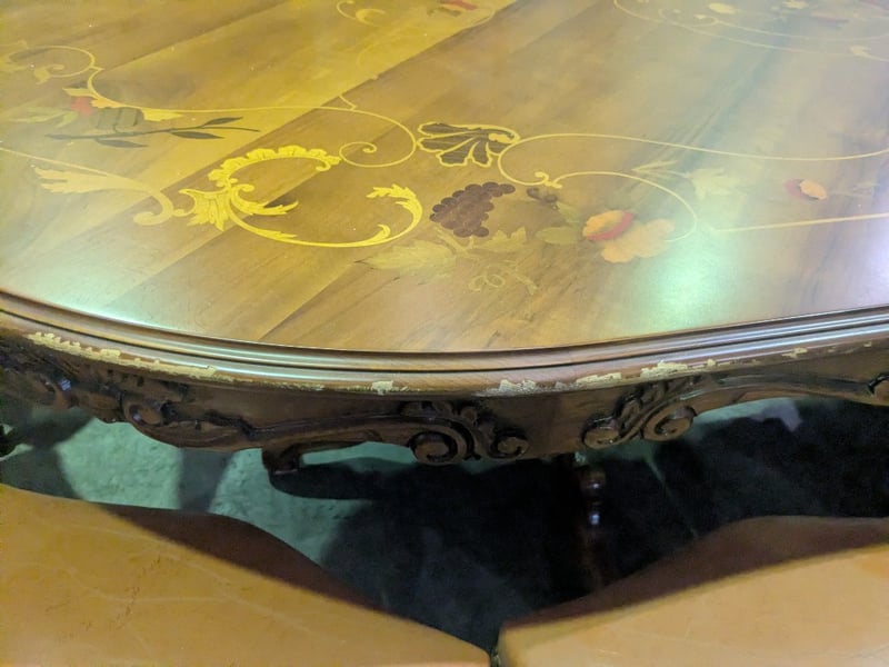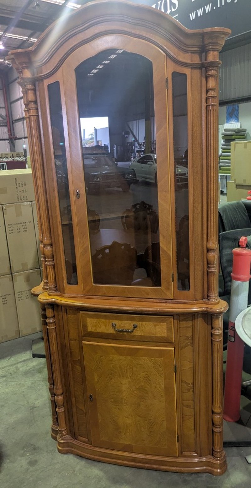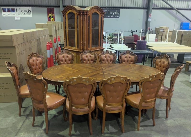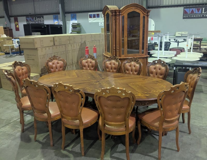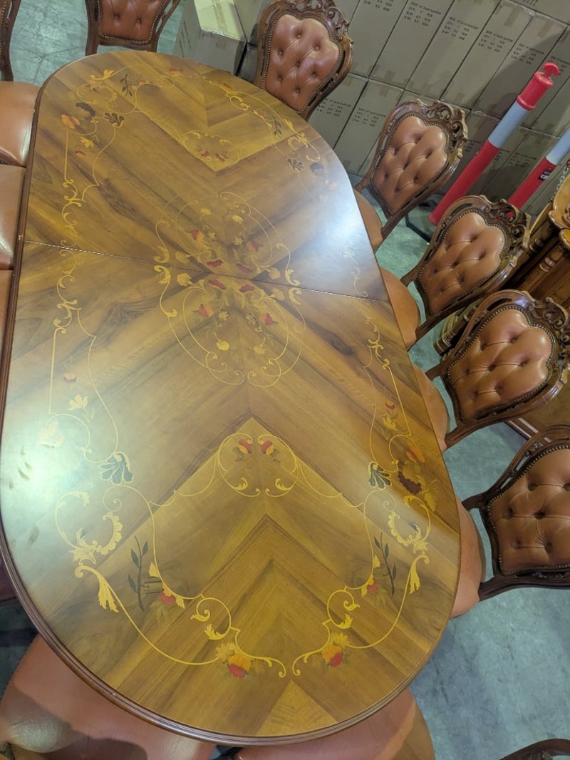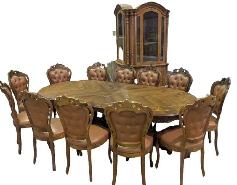 EXTENDABLE OVAL DINING TABLE AND CORNER DISPLAY CABINET Vintage Style Italian Marquetry Dining Suite, Characterized By Intricate Floral And Vine-Like Wood Inlays On The Tabletop And Tufted Upholstery On The Matching Chairs. Seat Between 8-12 People. Solid Wood Corner Display Cabinet Featuring Glass-Front Doors, Ornate Molding, And A Lower Storage Cabinet With A Draw Vendor Advises: Imported In The 1970 And Believed To Be Rococo Revival Influenced Dimensions Table: L250Cm X W120Cm X H78Cm Cabinet: L145Cm X W70Cm X H223Cm Condition: Good - Refer To Images SR 233618+1