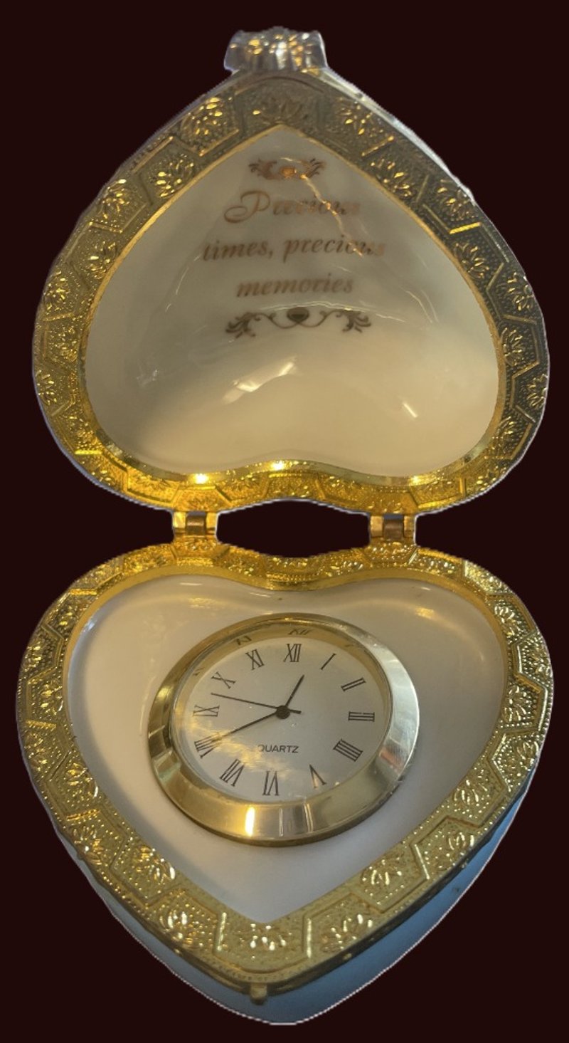 PORCELAIN LOVE HEART CLOCKItem Size: Height: 9cm, Width: 10cm, Depth: 10cm, Weight: 0.5KgCondition: Good - Refer To Images587946+25
