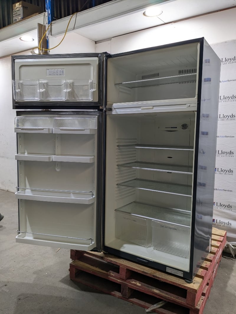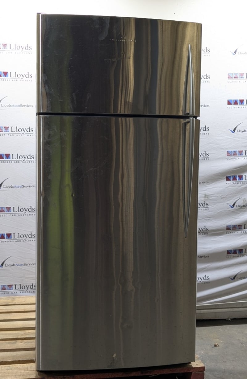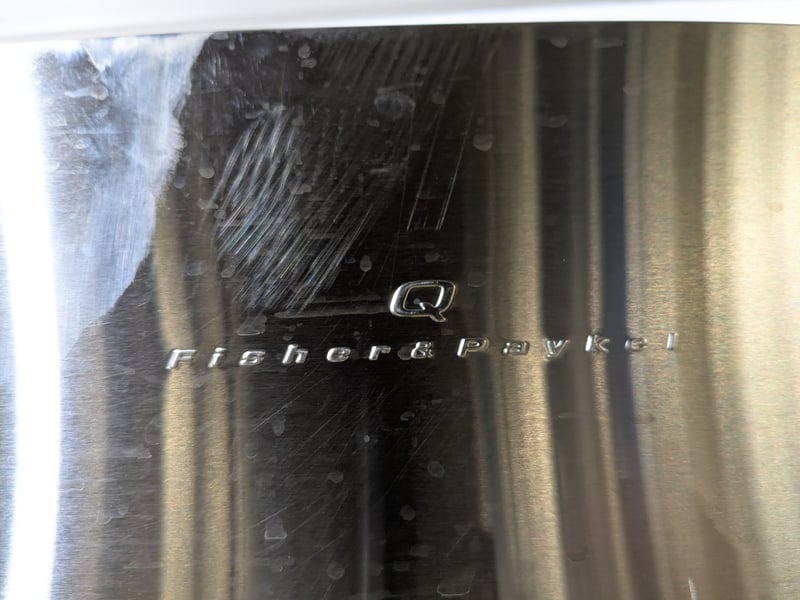 Stainless steel Fisher & Paykel top-mount refrigerator.