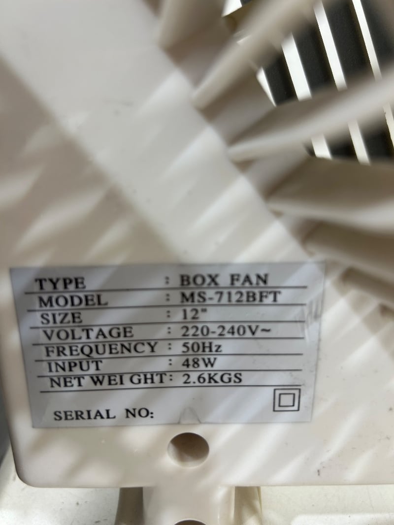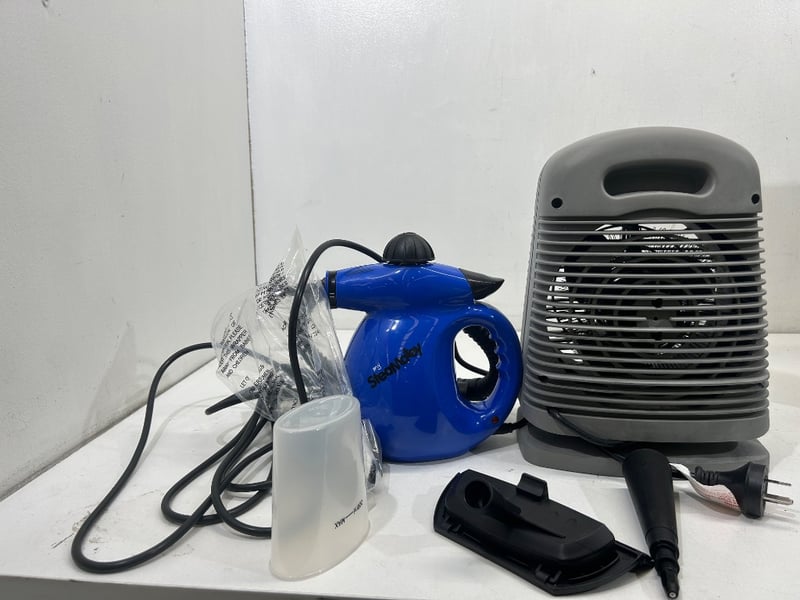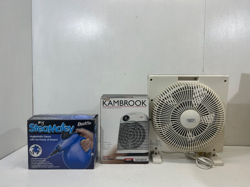 Includes a 12” box fan, Kambrook upright fan heater (2400W), and Steam Matey handheld steam cleaner with accessories.