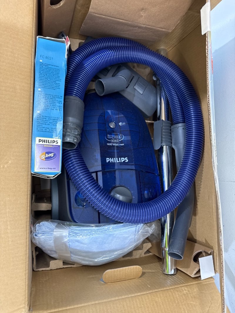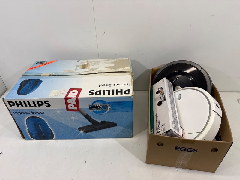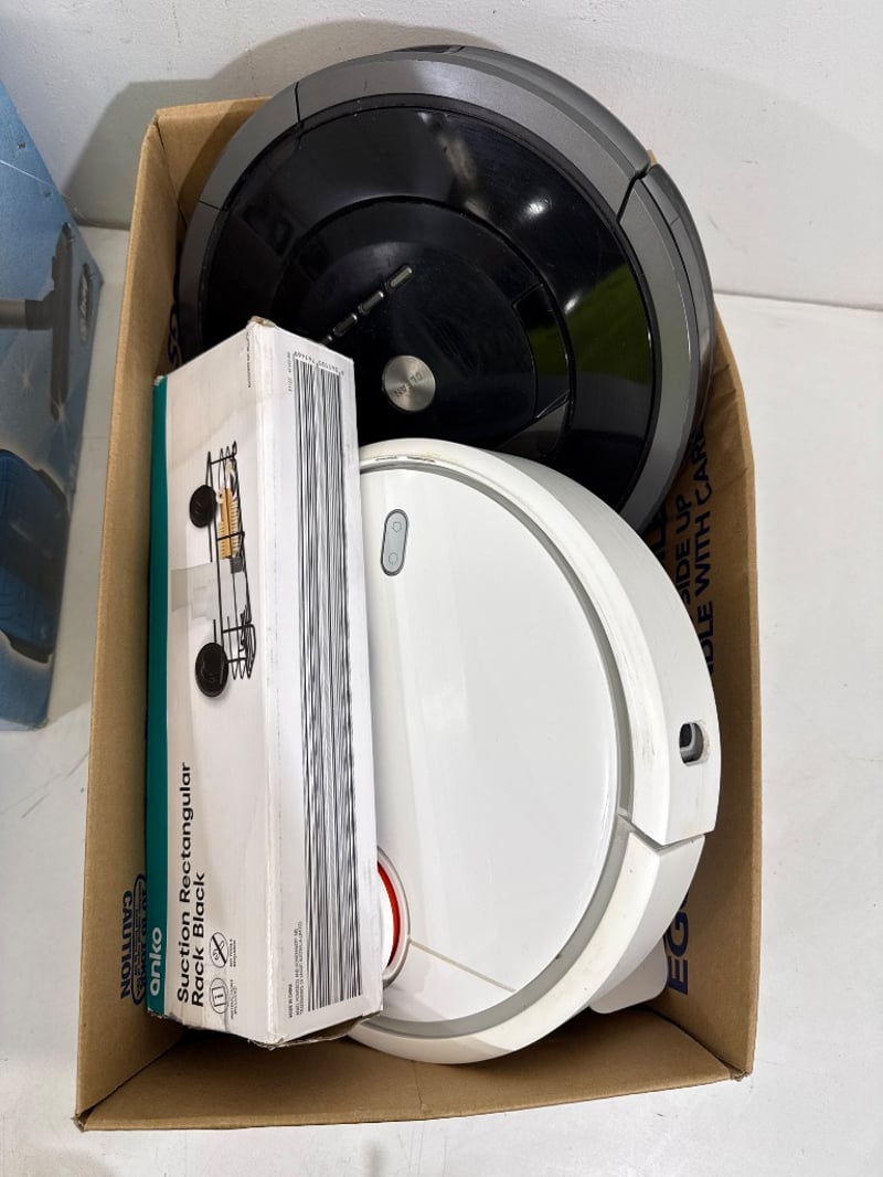 House Cleaning accessories, brands are Philips, Anko ect. Items include robot vacuums, suction rectangular rack and vacuum cleaner. Quantity: 2 boxes, sold as lot