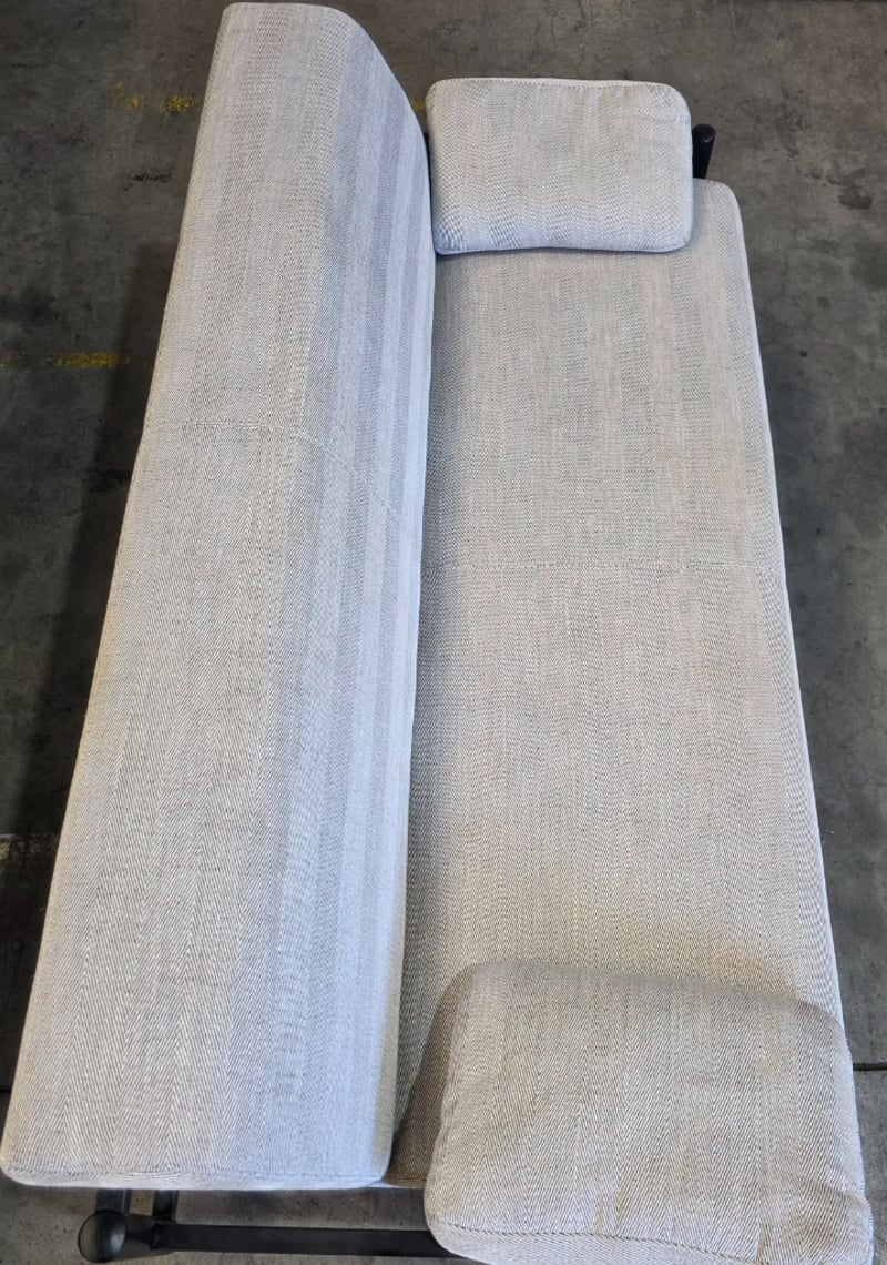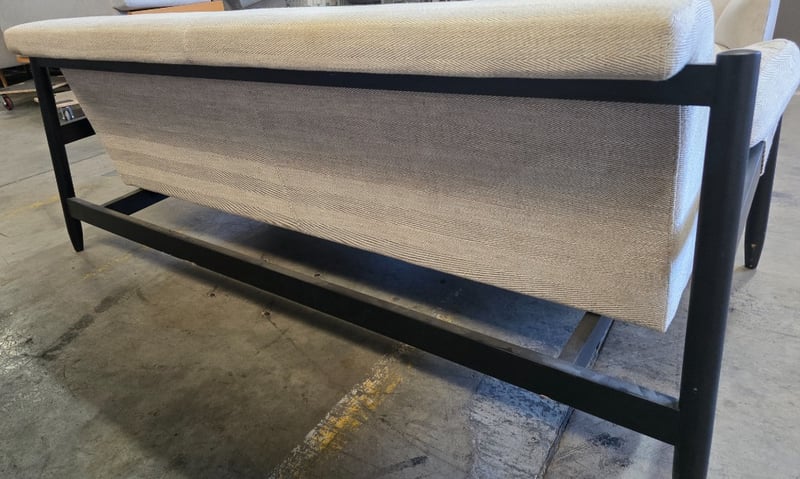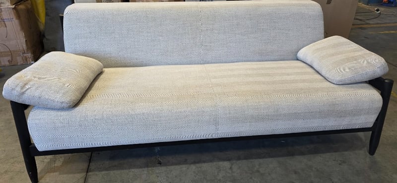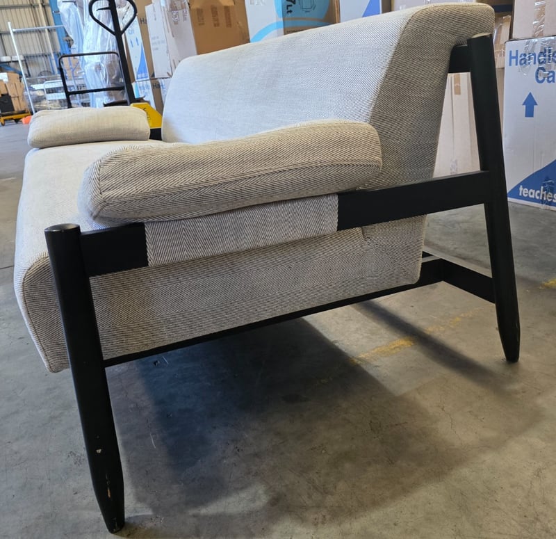 Two seater couch. Light grey fabricL 177cm x W 85cm x H 67cmNote: Marks and wear cleaning required.