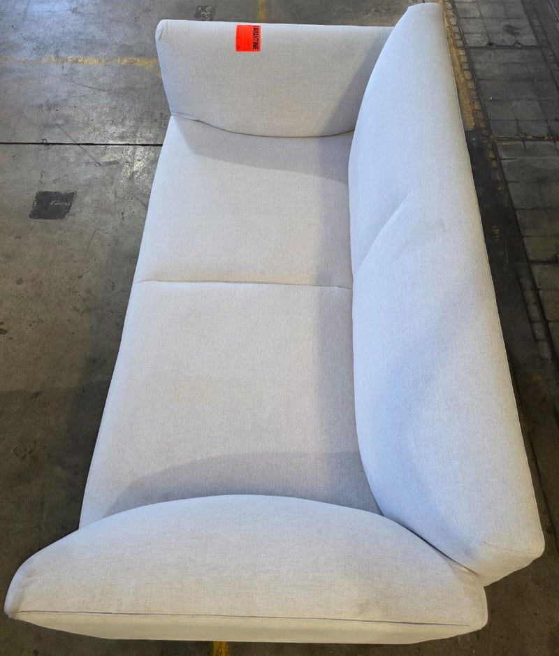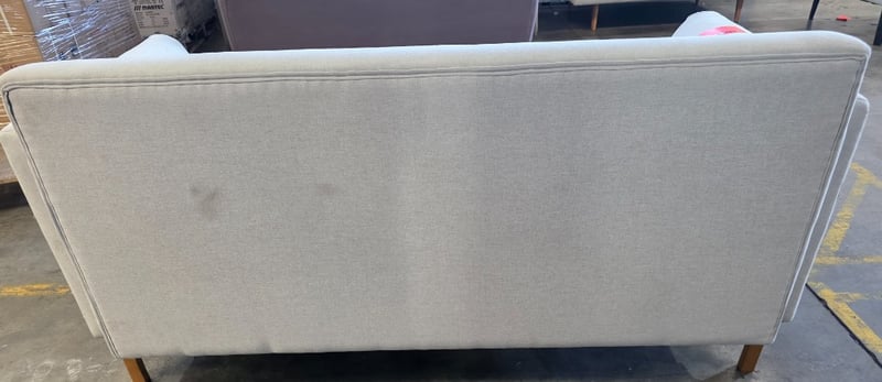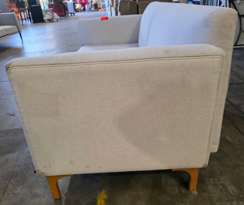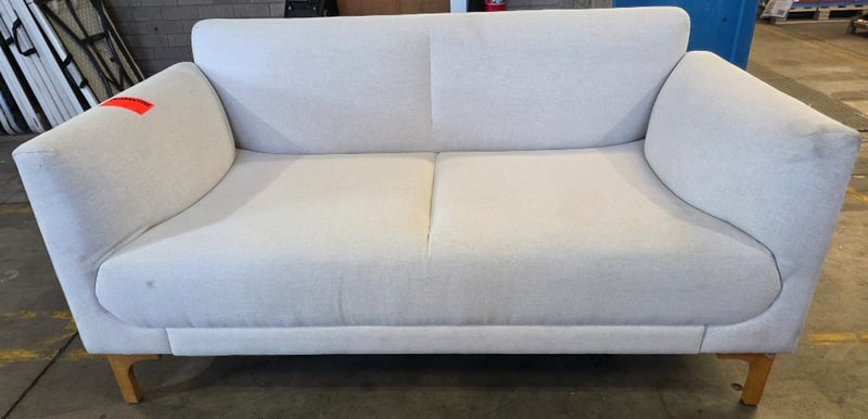 Two seater couch. Light greyL 160cm x W 80cm x H 80cmNote: Marks and wear cleaning required.