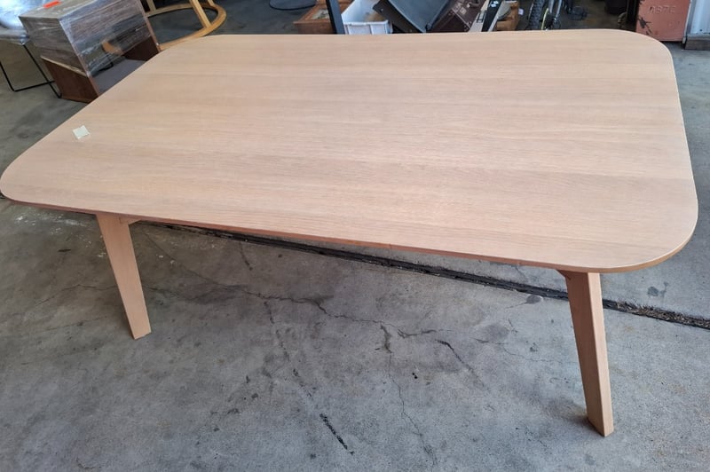Dinning timber table, white-Natural finish, round corners Dimensions: 180cmW x 105cmD x 76cmHNote: Scratches, marks