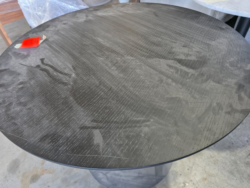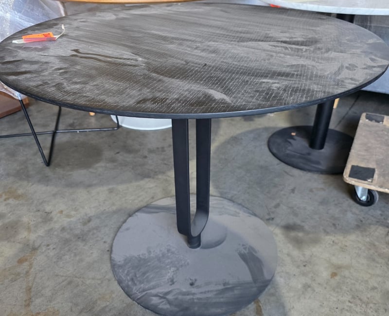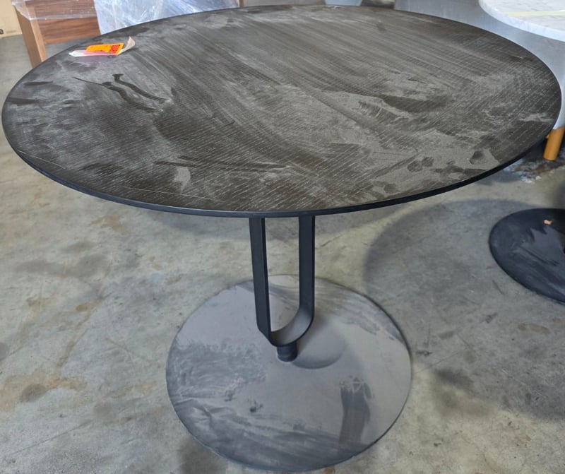Timber round table with black metal base. Black.Dimensions: 80cmW x 80cmD x 95cmHNote: Scratches, dents, marks, Inspection recommended