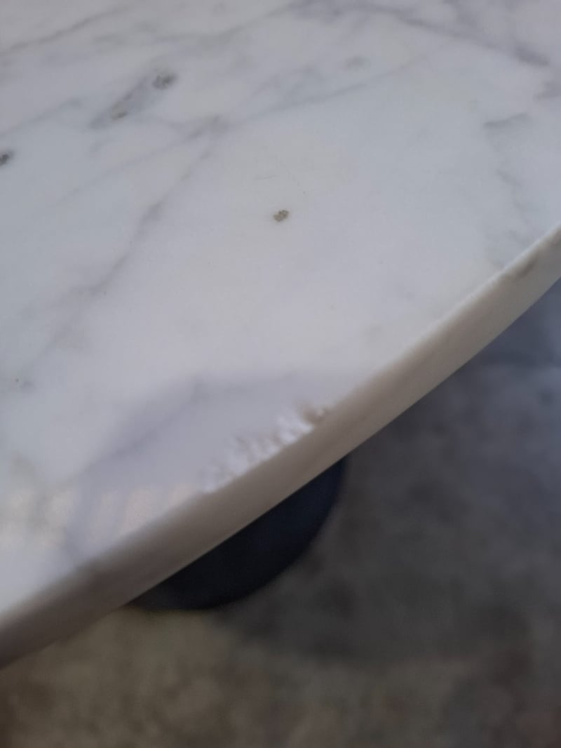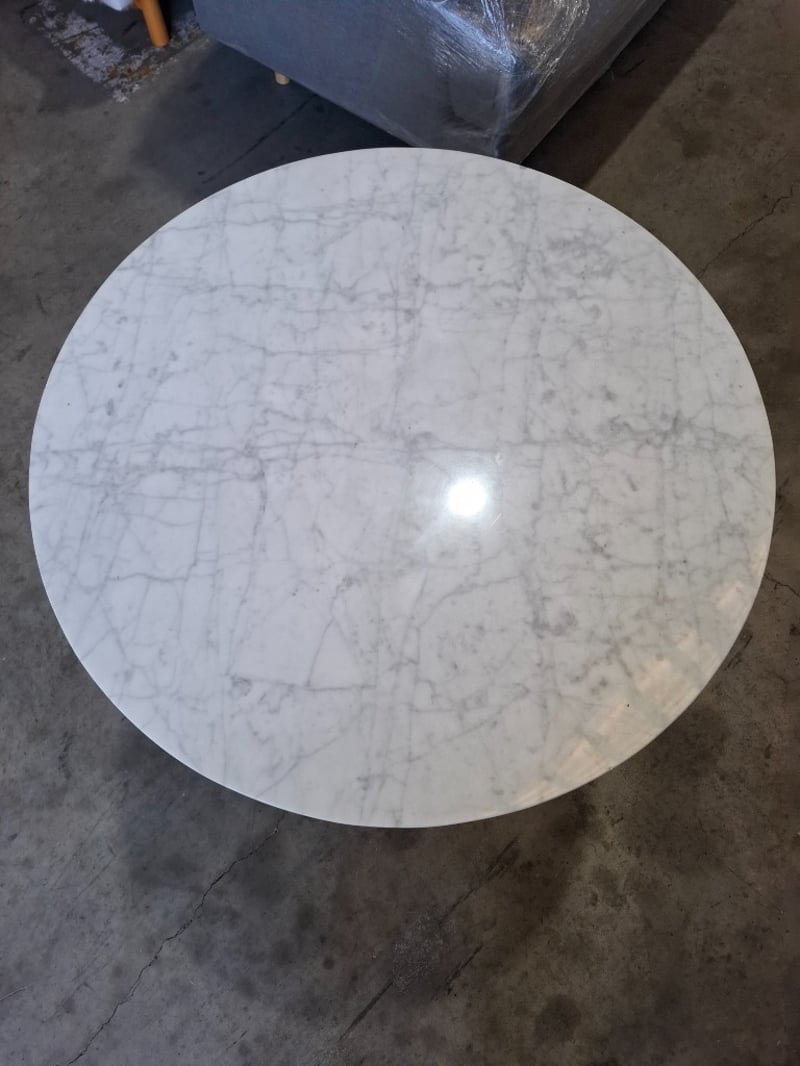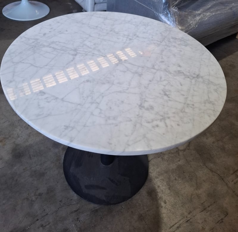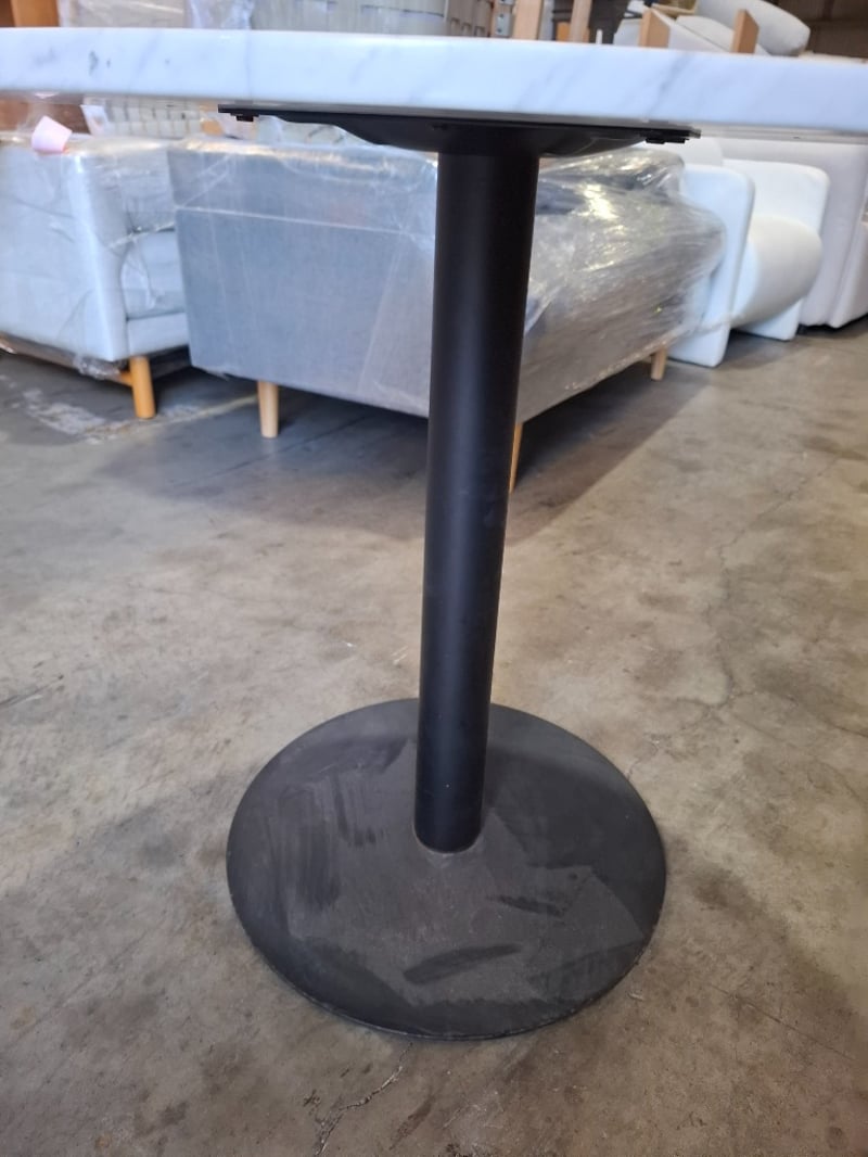 Round white marble Table, black round metal baseDimensions: 80cm Diameter x 75 cmHNote: Scratches, marks, scuff