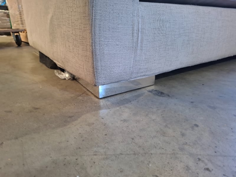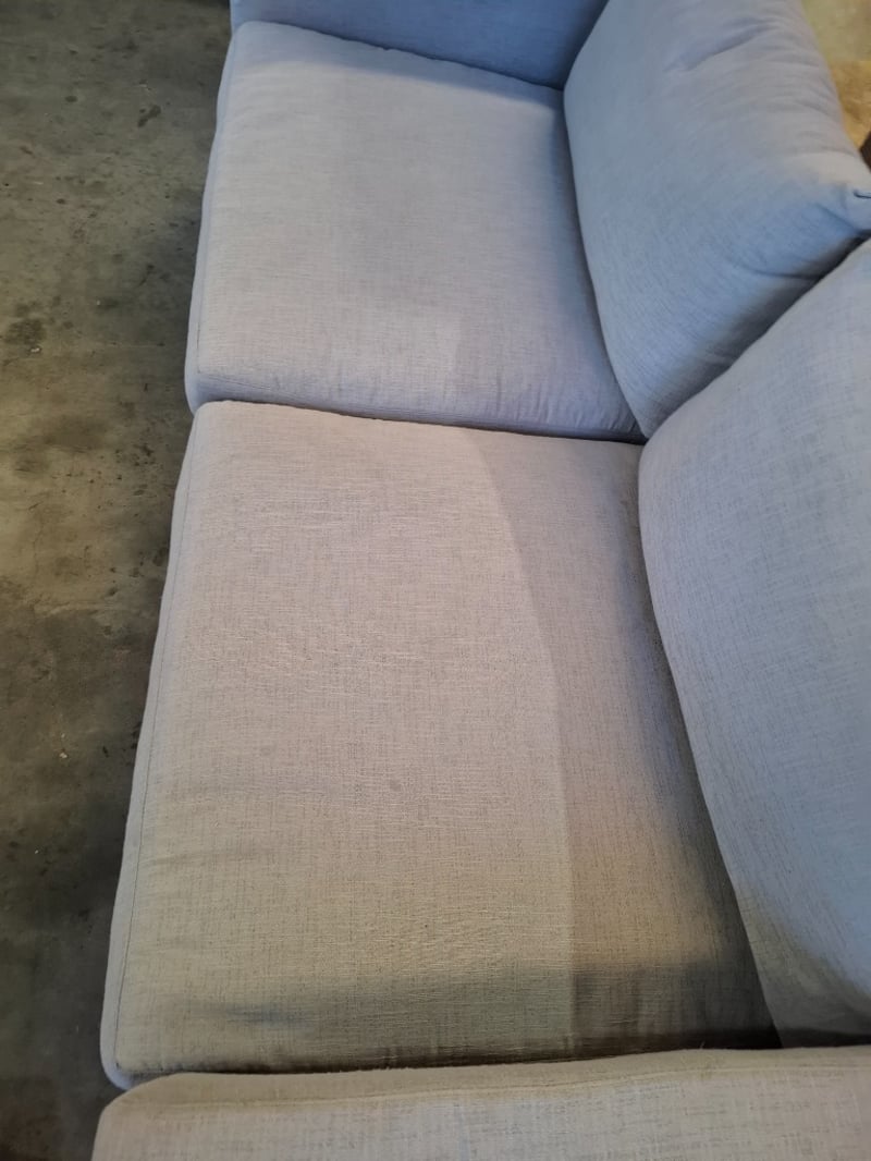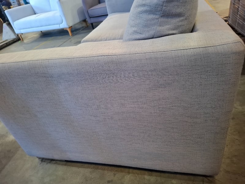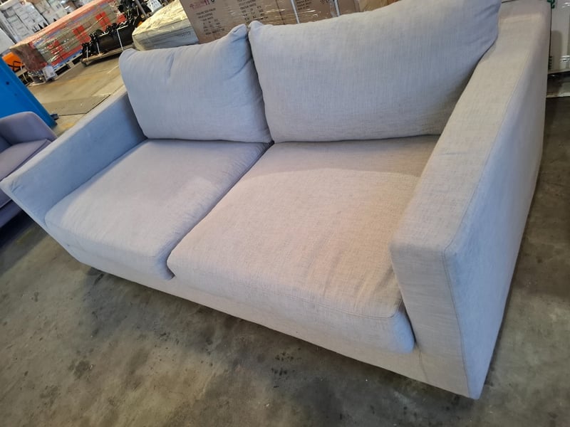 Two seater couch, grey colour fabric, chromed feet Dimensions: 207cmW x 104cmD x 64cmHNote: waer and tear, cleaning required
