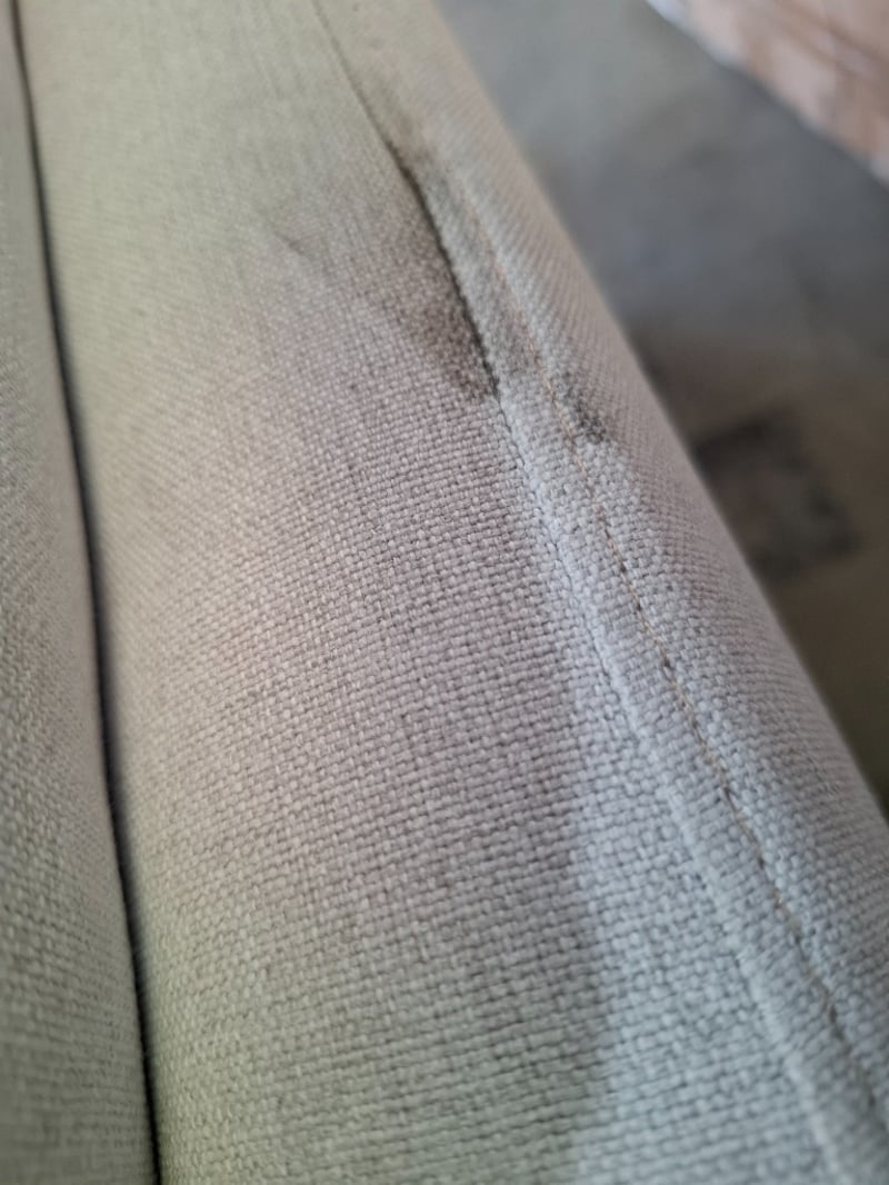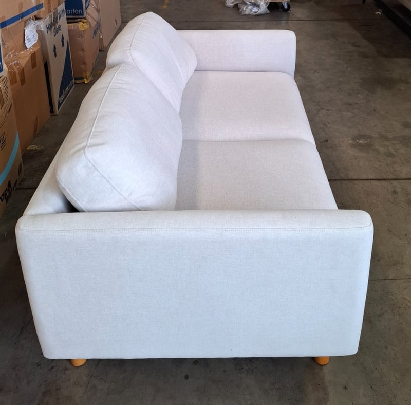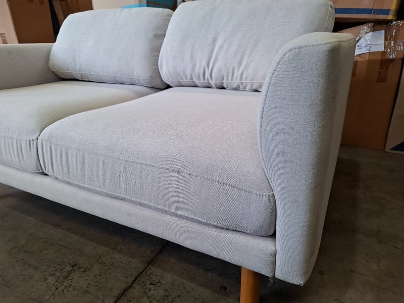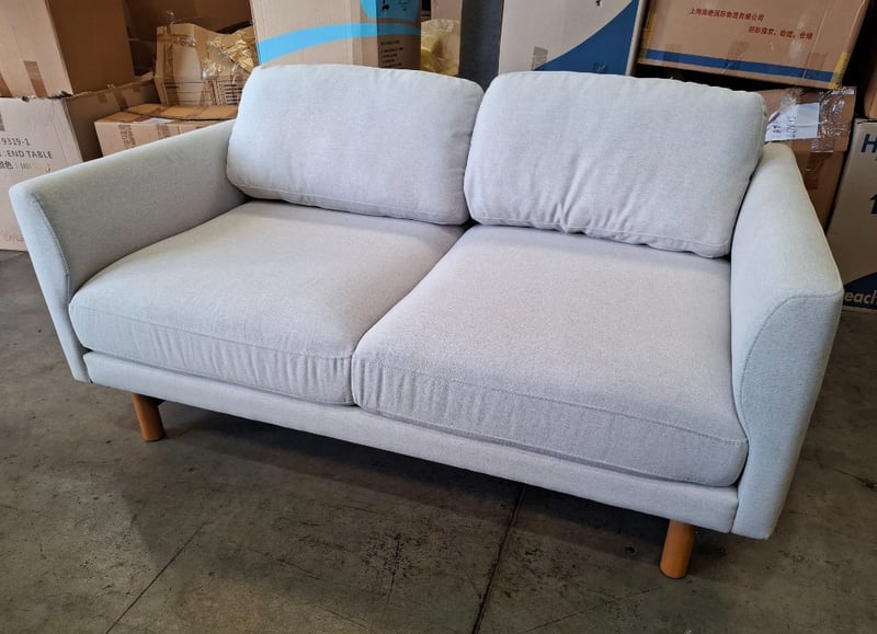 Two seater couche, light grey/white colour fabric, timber natural legs Dimensions: 152cmW x 90cmD x 65cmHNote: cleaning required