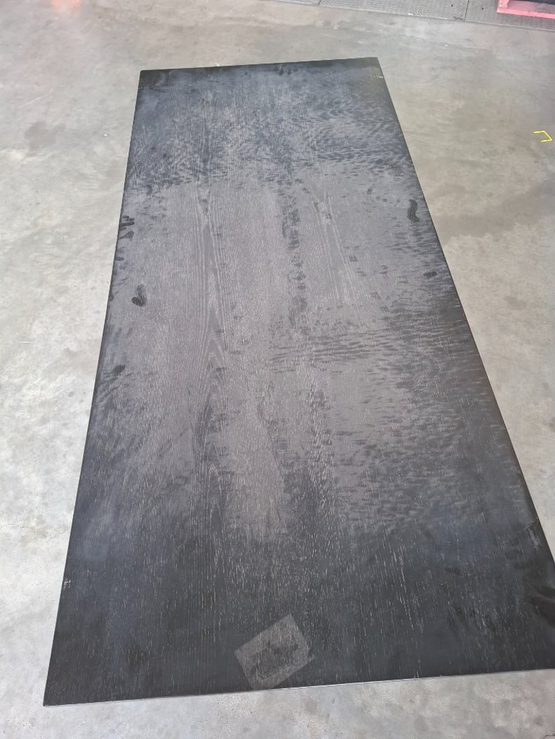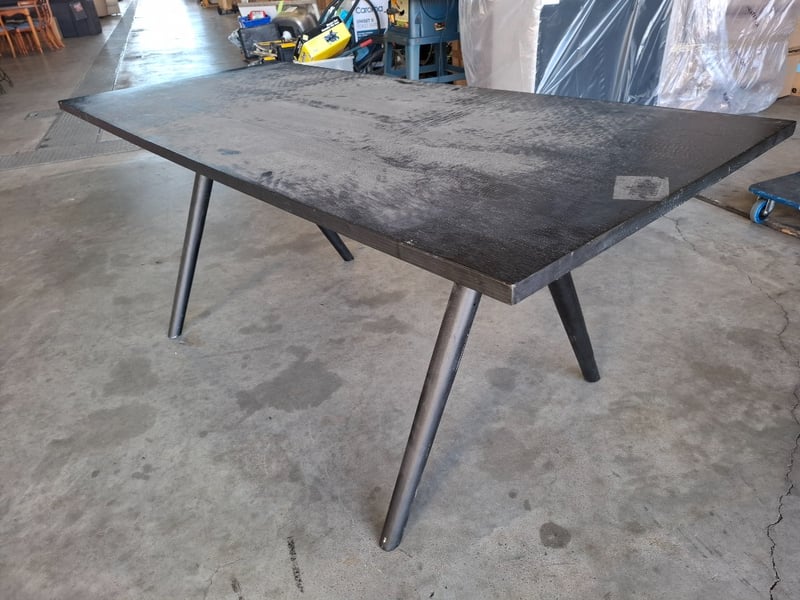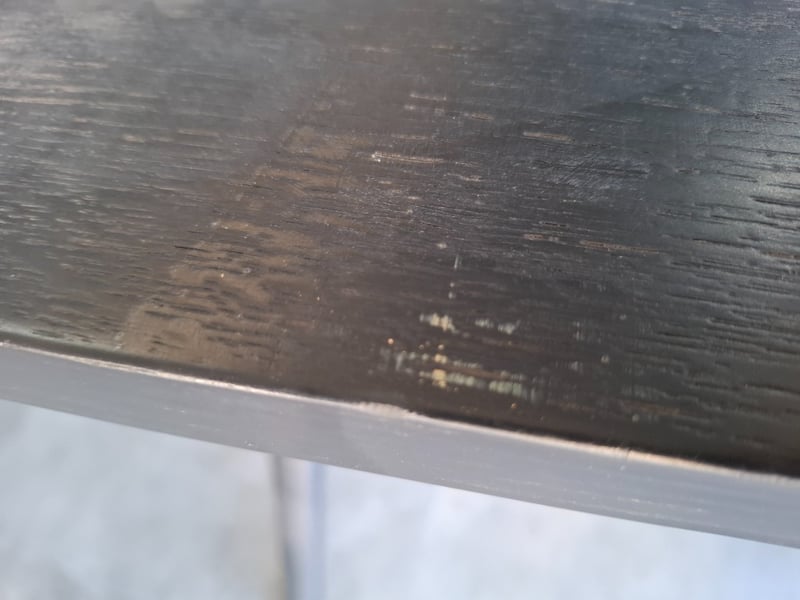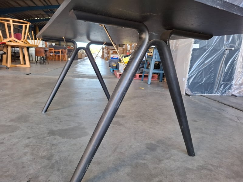 Timber dining table, black finished Dimensions: 180cmW x 80cmD x 76cmHNote: Scratches, marks, cleaning required