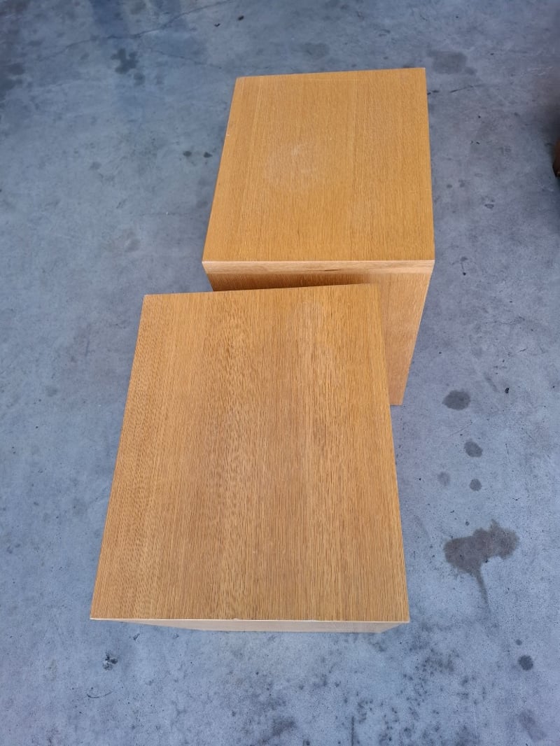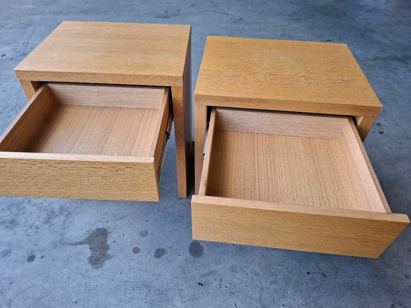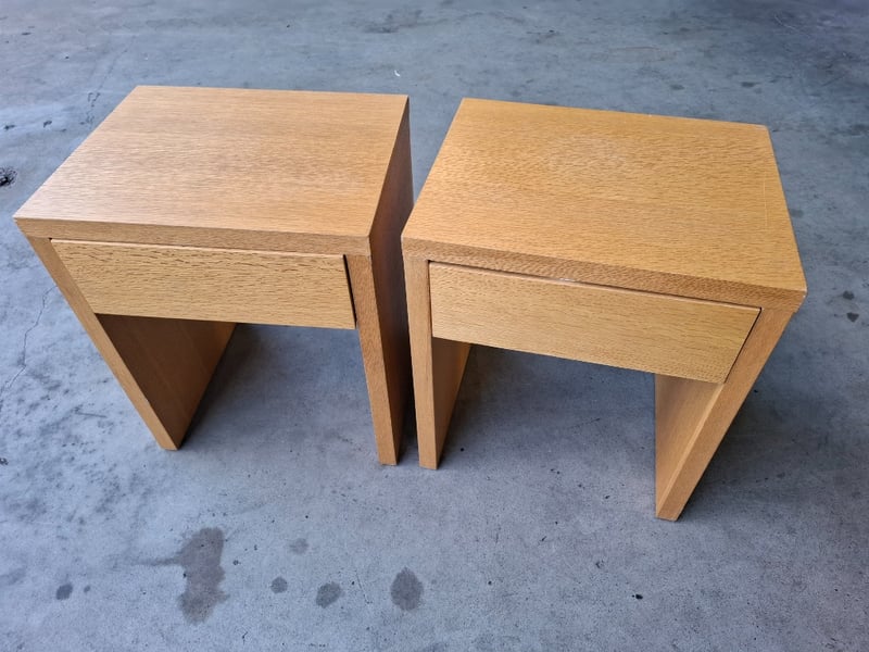 2 x Timber Bed side-table, 1 drawer natural inished Dimensions: 50cmW x 40cmD x 60cm H Note: Marks, cleaning required