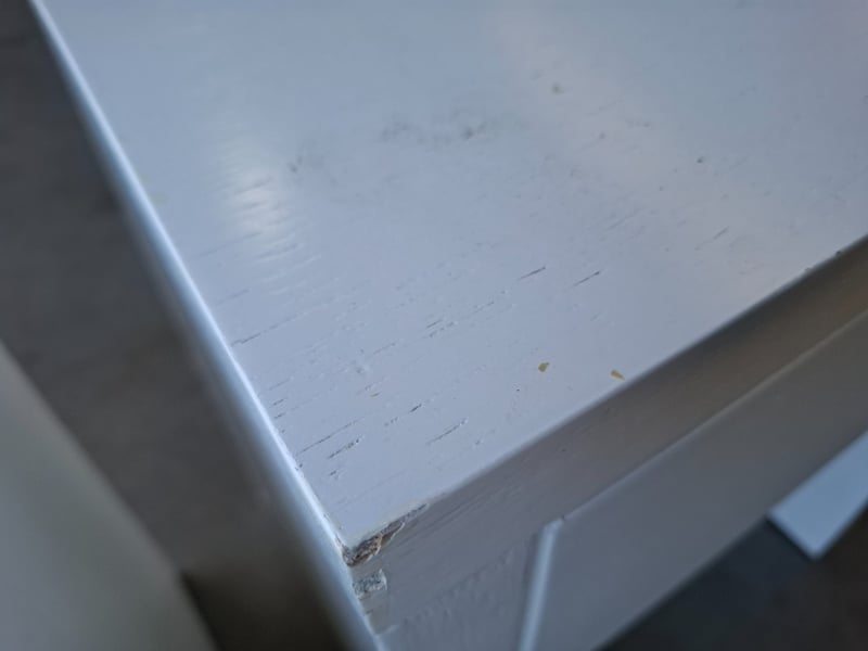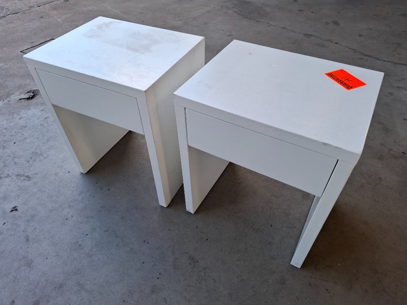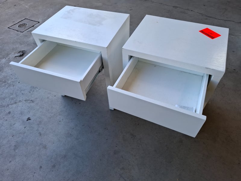 2 x Timber Bed side-table, white finished Dimensions: 60cmW x 40cmD x 61cm H Note: Marks, cleaning required