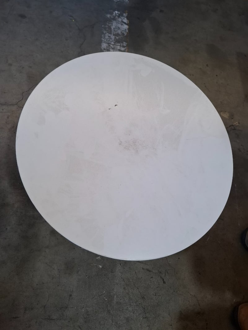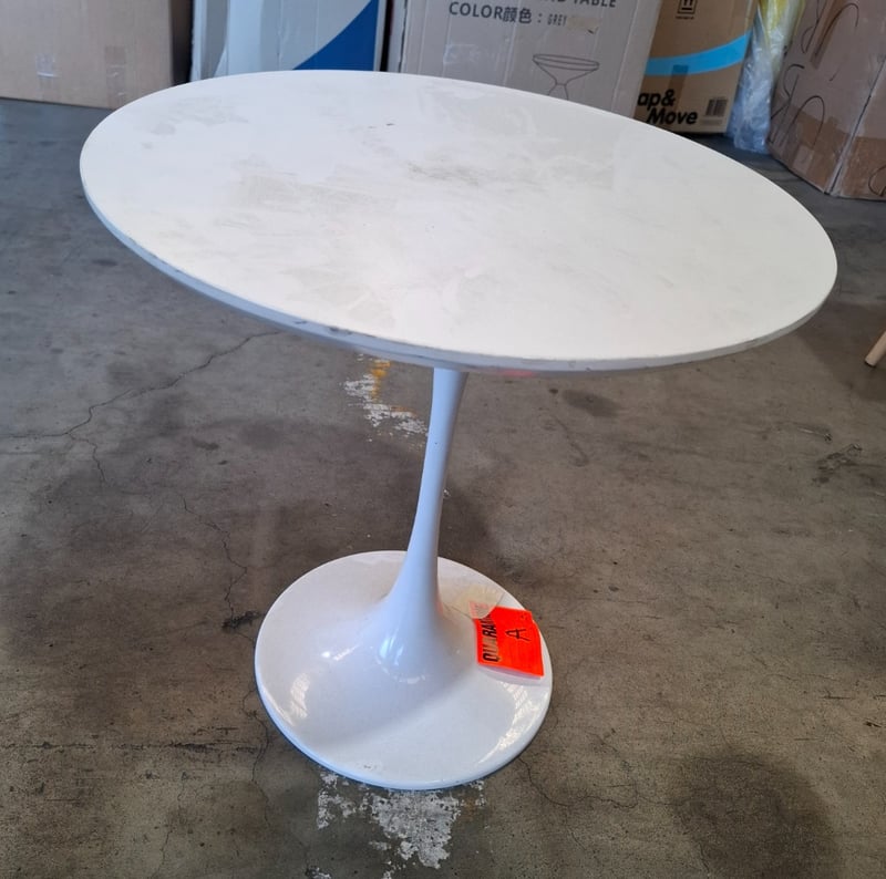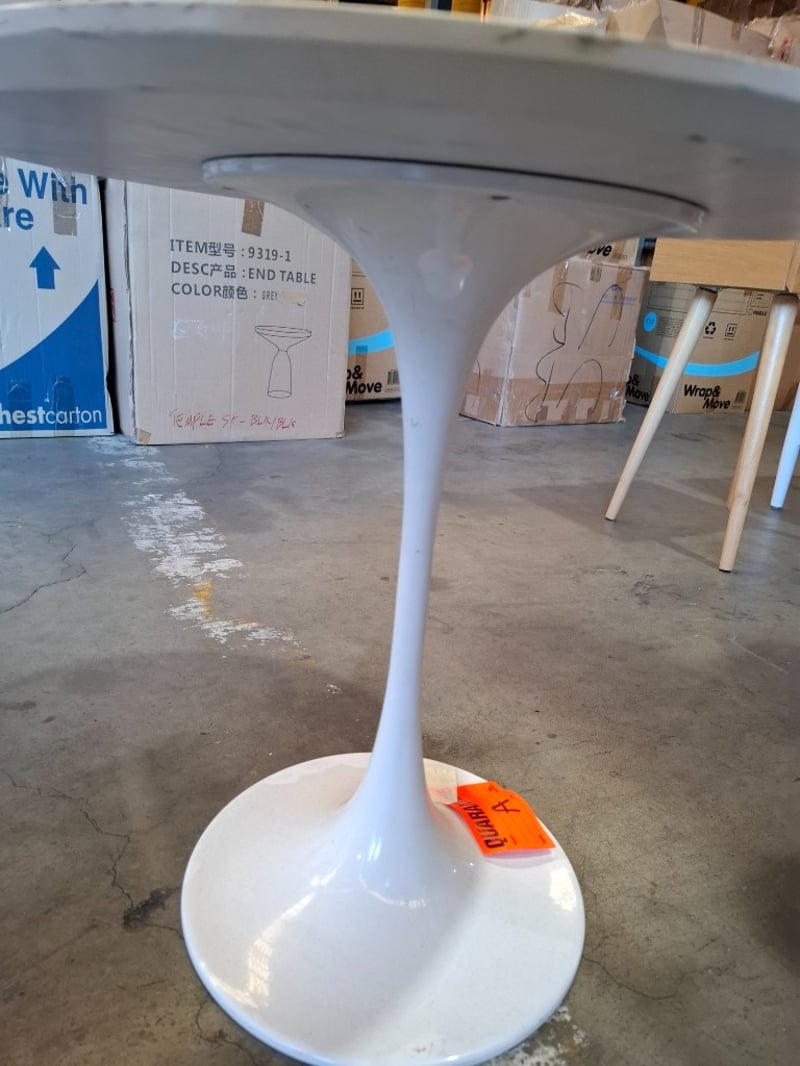 Round side table, white metal base Dimensions: 50cm Diameter x 50cm H Note: Marks, cleaning required