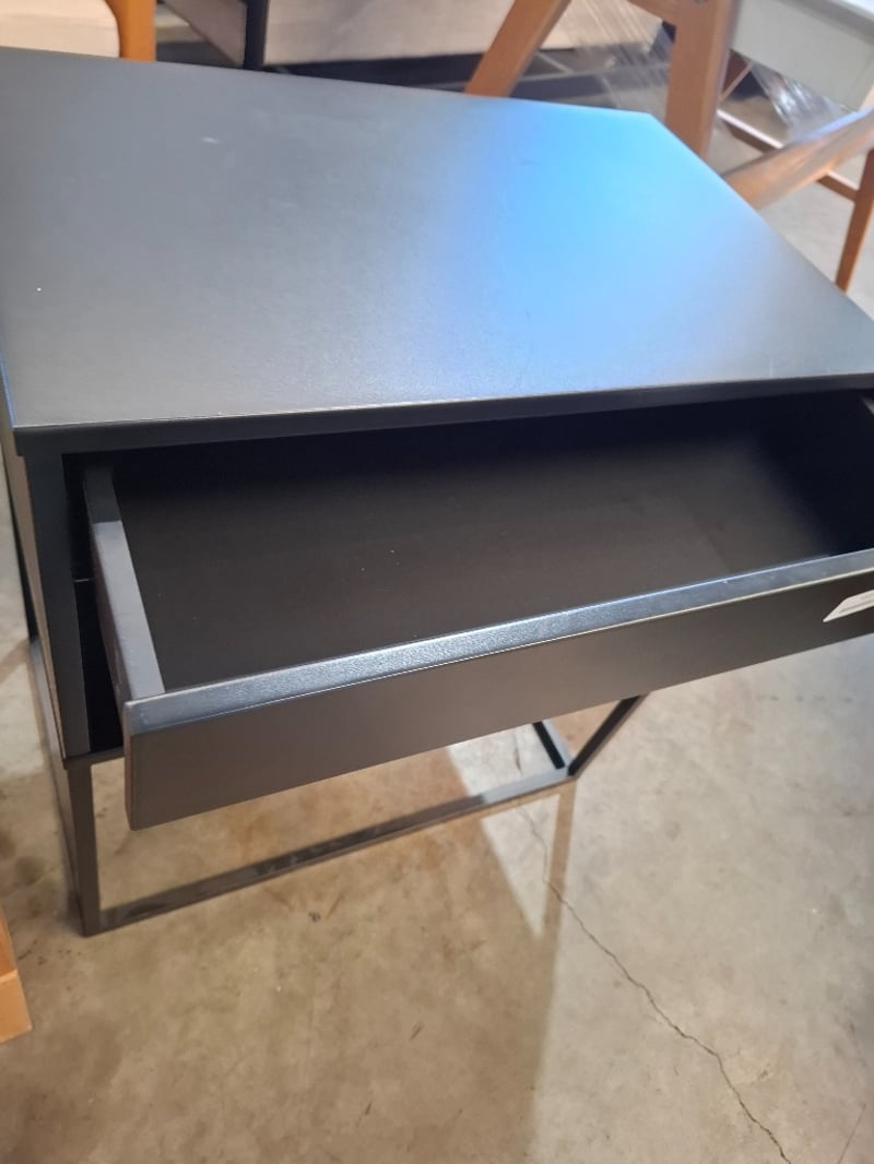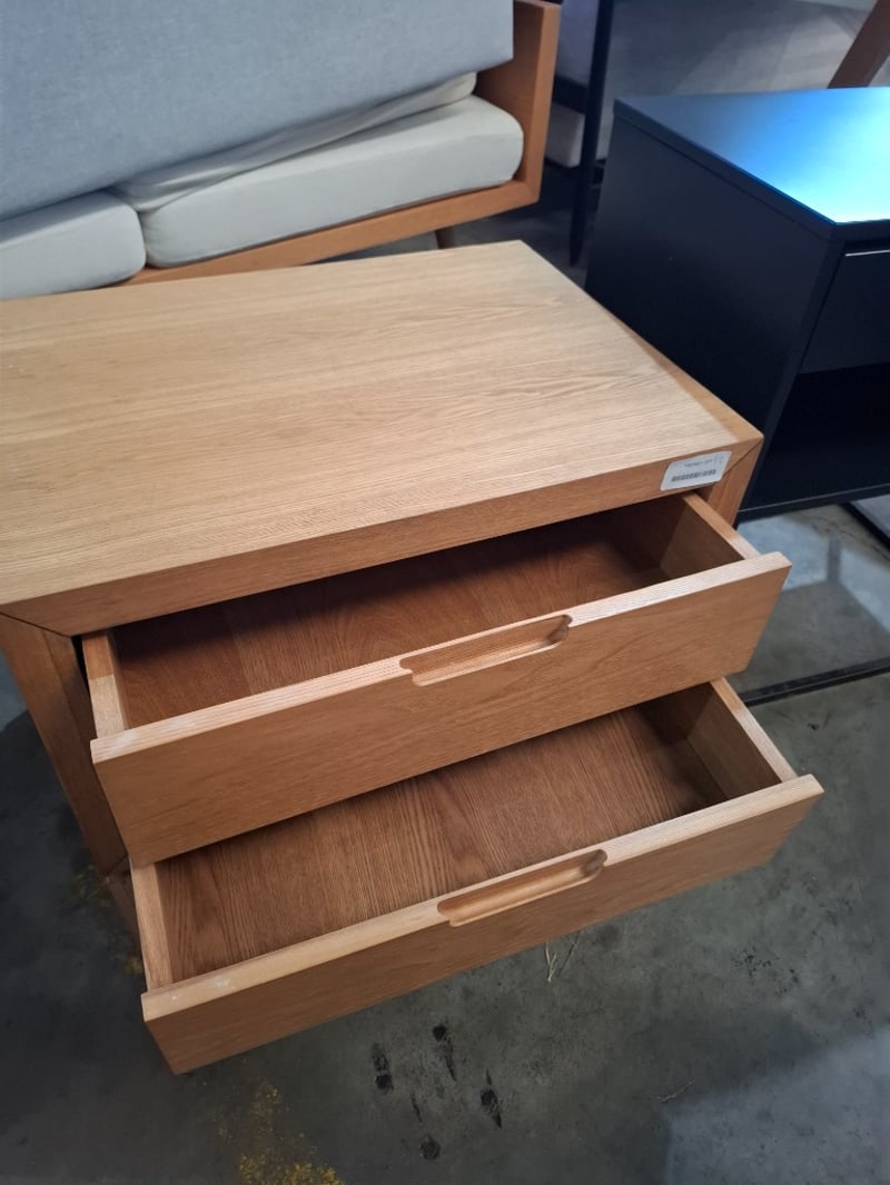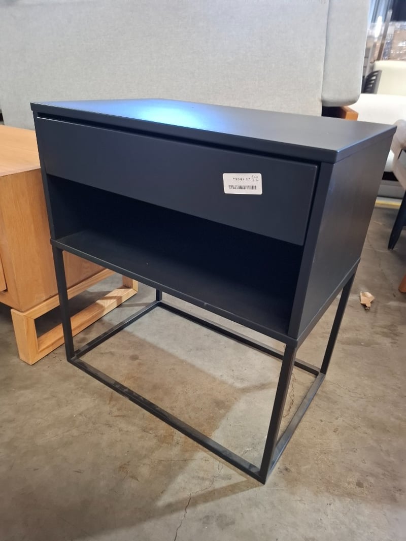 2 x Timber Bed side-table, metal frame models vary natural/black finished Dimensions: 60cmW x 45-39cmD x 52-66cm H Note: Marks, cleaning required