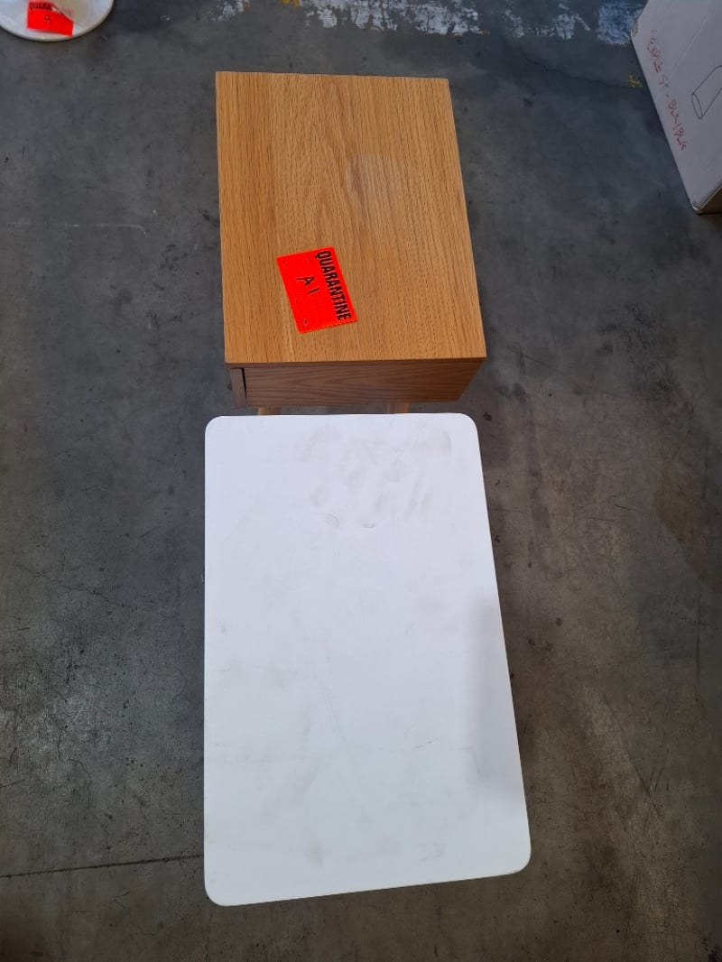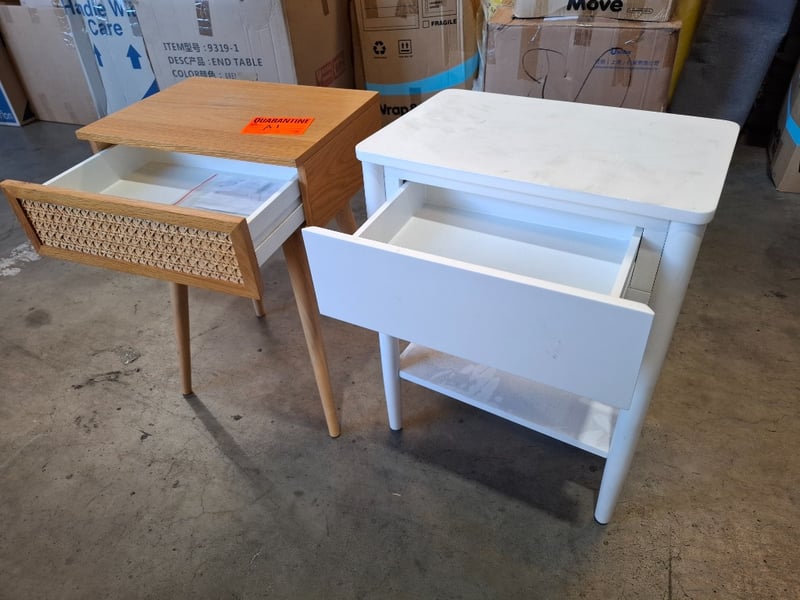2 x Timber Bed side-table, white/natural finished, models vary Dimensions: 46-40cmW x 30cmD x 60-61cm H Note: Marks, cleaning required