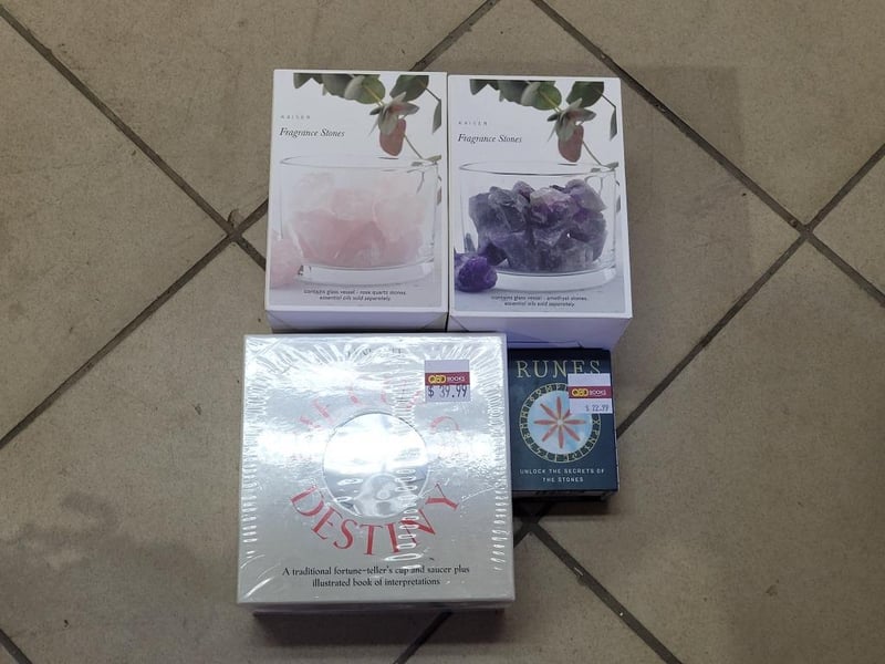 2x KAISER fragrance stones, rose quartz and amethyst stone, NEW factory sealed in box, 1x Jane Lyle "The Cup Of Destiny", fortune teller's cup, RRP $39.99, NEW factory sealed in box, 1x RUNE stone, with mini book, NEW sealed in box