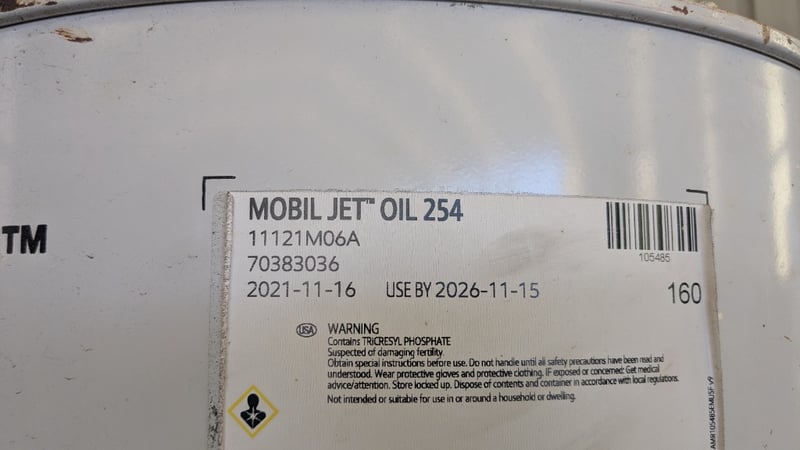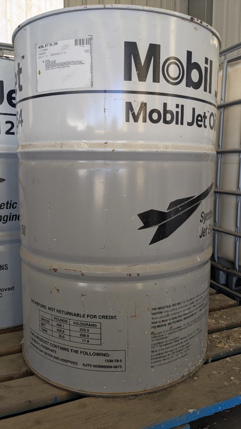 Mobil Synthetic Jet Oil 254 Product Name: Mobil Jet™ Oil 254 Production Date: 2021-11-16 Expiration Date: 2026-11-15 Net Volume: 208L NOTE: INSPECTIONS HIGHLY RECOMMENDED Bid Per Each Location: Murarrie, QLD Contact: Mark David - 0437 318 344