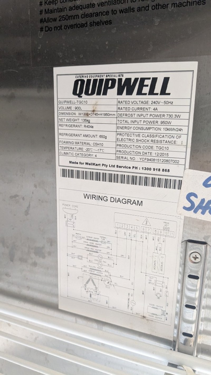 COMMERCIAL 2 DOOR QUIPWELL FREEZER 900L-TGC10Brand: QUIPWELLModel; TGC10Key Features: Large 900L capacity suitable for bulk frozen goods, Twin solid doors for excellent temperature retention, Fan-assisted cooling for fast pull-down and even temperature distribution, Digital temperature controller for precise, stable freezing, Adjustable internal shelving to suit a wide range of products, Heavy-duty commercial build designed for continuous operation, Self-closing doors to reduce cold loss and improve efficiencyExtras: Capacity: 900L, Temperature range: –18°C to –22°C, Doors: 2 solid swing doors, Power: 240V, on CastorsDimensions: 1180mm(W) x 700mm(D) x 1950mm(H)NOTE:INSPECTIONS HIGHLY RECOMMENDED, BUYER TO PROVIDE OWN LABOUR AND TOOLS FOR SAFE REMOVAL OF ASSETLocation: Murarrie, QLD Contact: Mark David - 0437 318 344