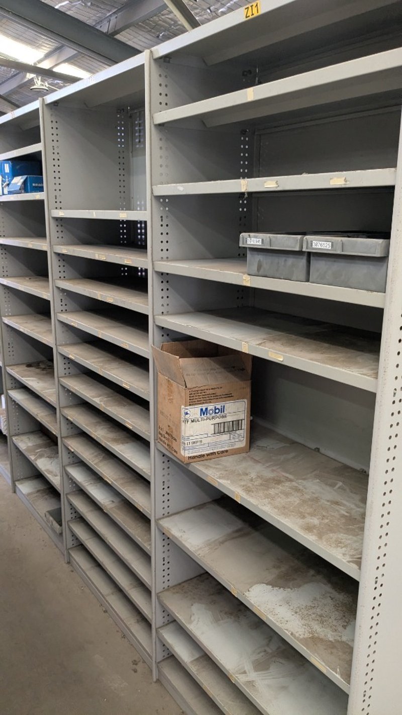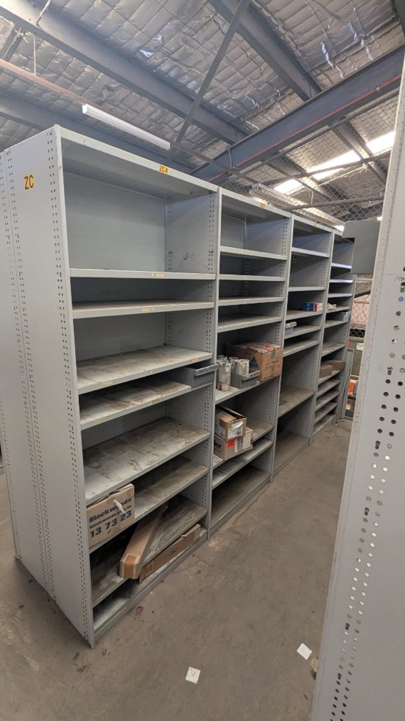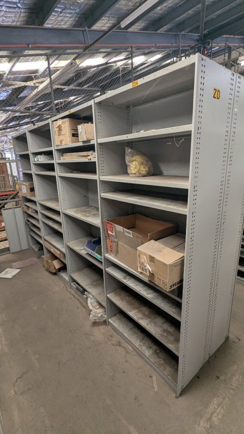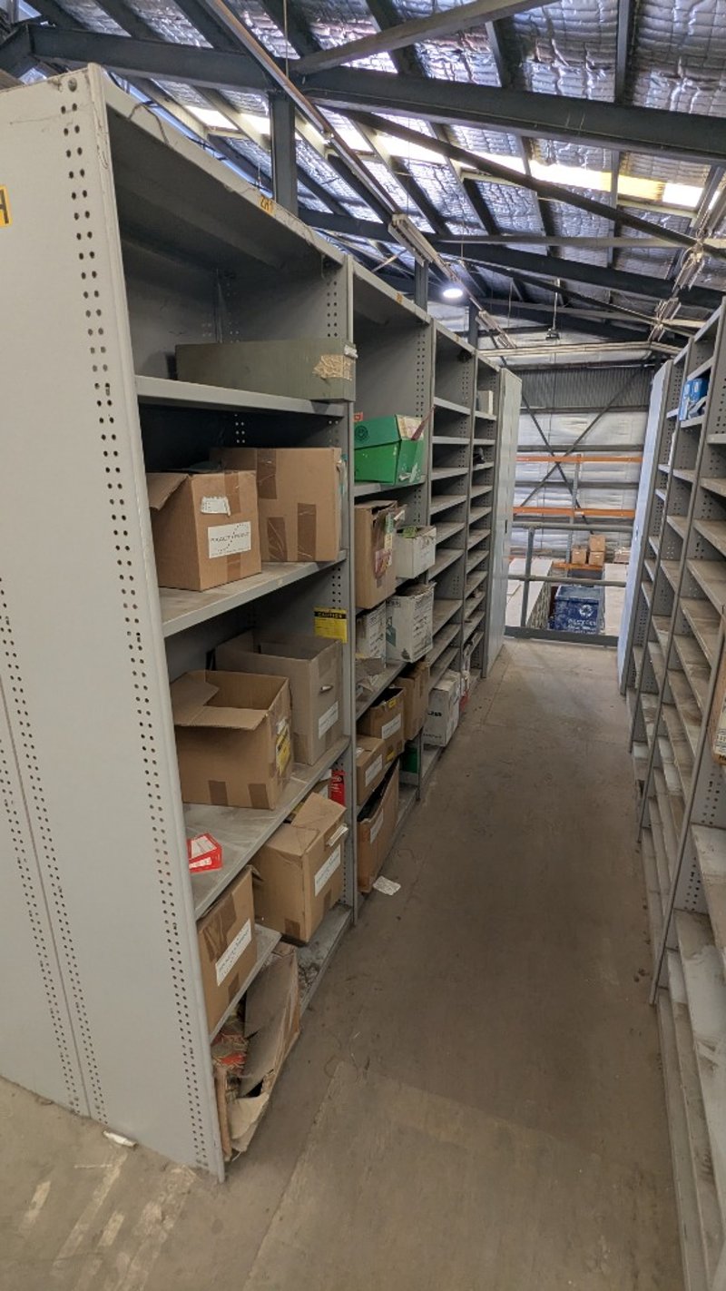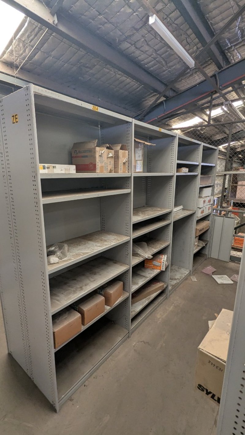 Rut Shelving, 4 bays Wide, Multiple Tier, 14 x Bays Dimensions: 3600mm(W) x 830mm(D) x 2150mm(H) SOLD AS LOT NOTE: DISASSEMBLLY REQUIRED, CONTENTS NOT INCLUDED, INSPECTIONS HIGHLY RECOMMENDED, BUYER TO PROVIDE OWN LABOUR AND TOOLS FOR SAFE REMOVAL OF ASSETLocation: Murarrie, QLD Contact: Mark David - 0437 318 344