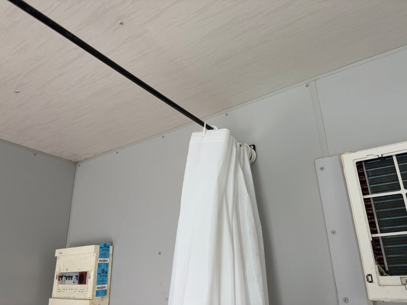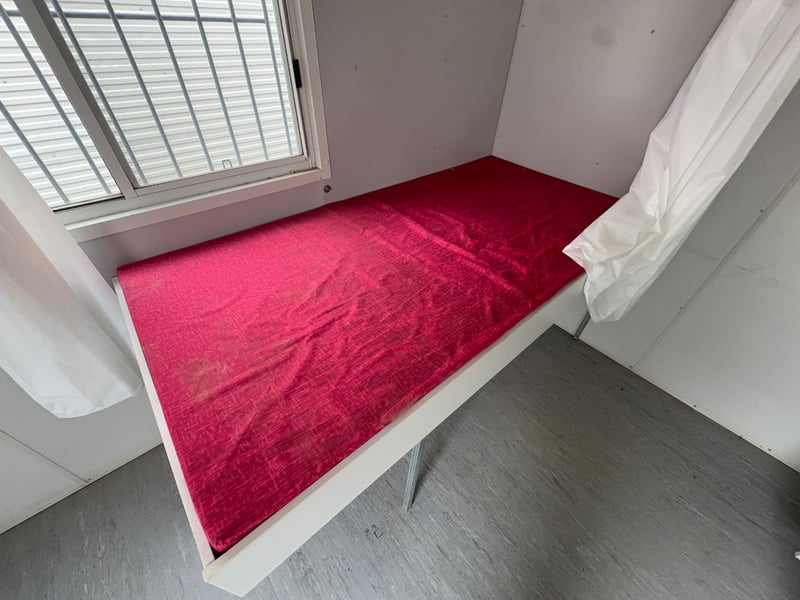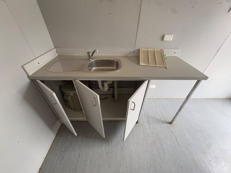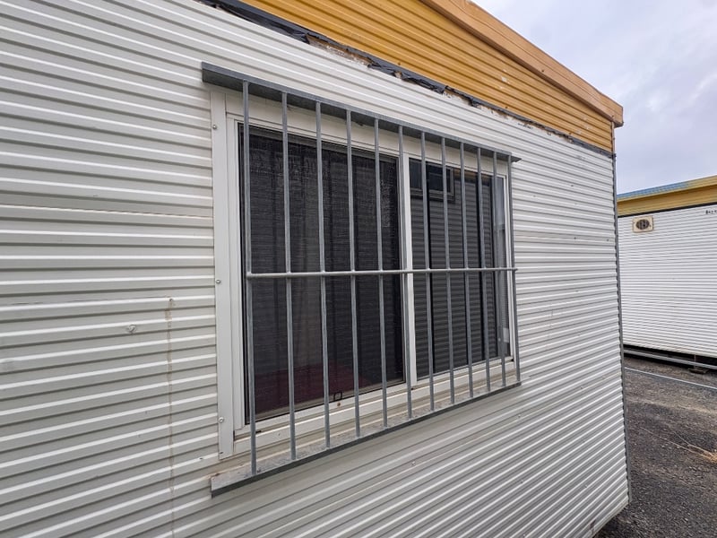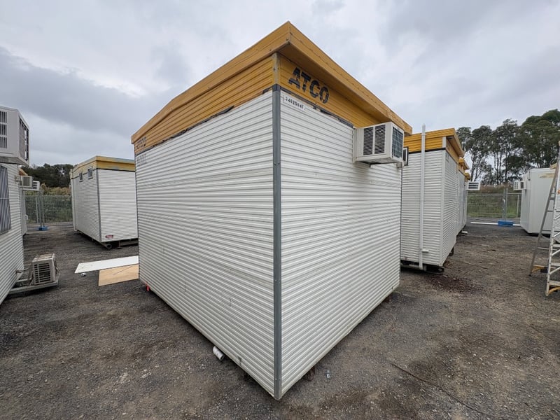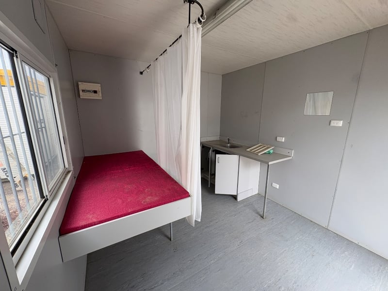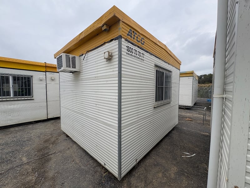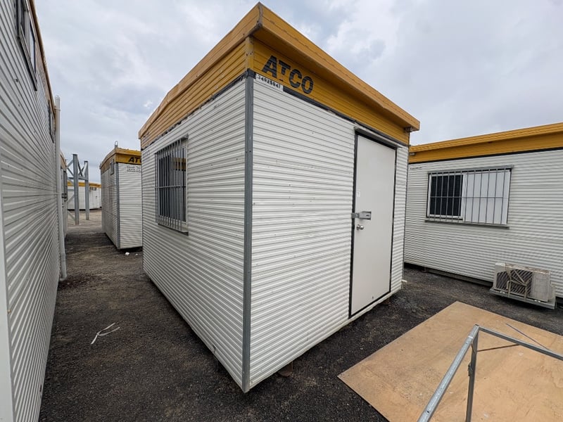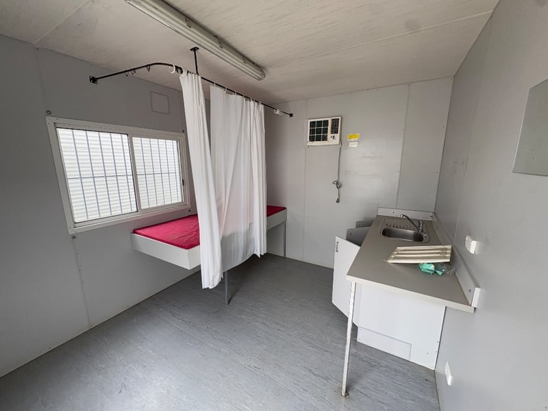 FIRST AID OFFICE WITH BED AND BENCH, BRAND: ATCO, SINGLE DOORS: X1, SLIDING WINDOWS C/W SECURITY BARS: X1, DUAL POWER POINTS: X1, SINGLE POWER POINTS: X3, STRUCTURALLY GOOD, INTERIOR FAIR/GOOD.