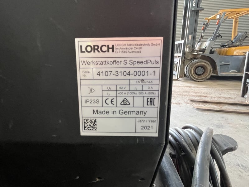 2021 Lorch S SpeedPulse XT MIG Welder Make: Lorch Model: S SpeedPulse XT Type: MIG Welder Year: 2021 Serial No: 4107-3104-0001-1 Made in: Germany Notes / Extras: Welding unit, control / wire feed unit, MIG torch and leads, mounted on wheeled trolley
