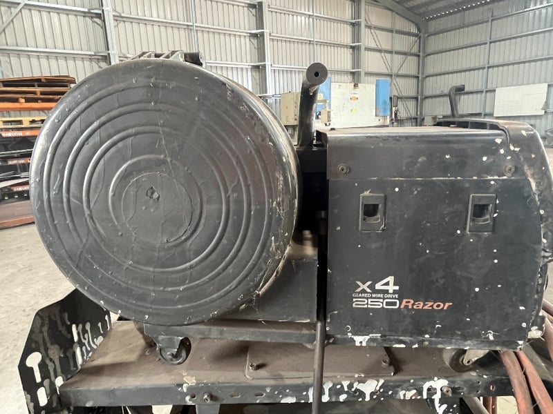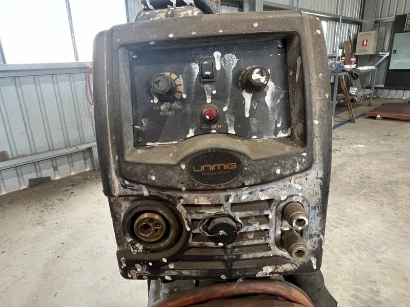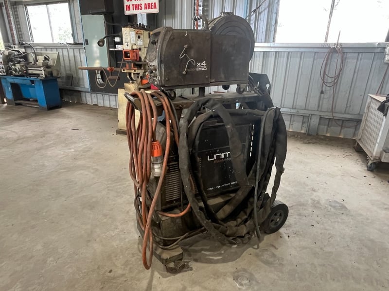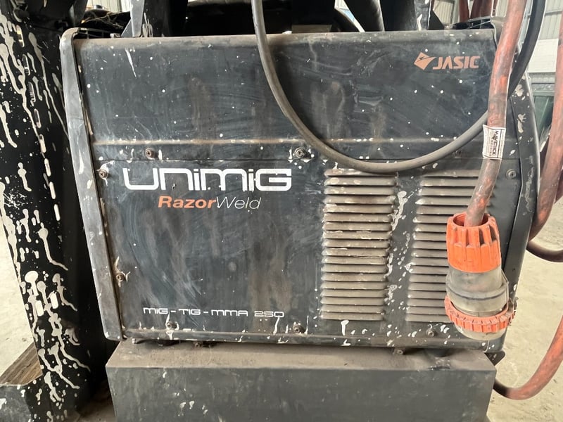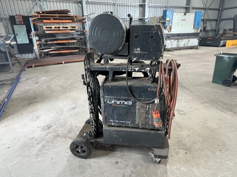 Unimig RazorWeld 250 MIG / TIG / MMA Welder PackageMake: UnimigModel: RazorWeld 250Type: MIG / TIG / MMA WelderNotes / Extras: Jasic manufactured unit, X4 geared wire drive feeder, wire reel holder, welding torch and leads, mounted on wheeled trolley, 3 phase power lead and plug visible