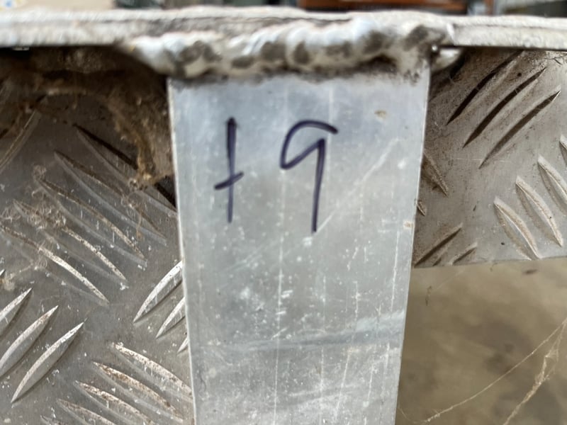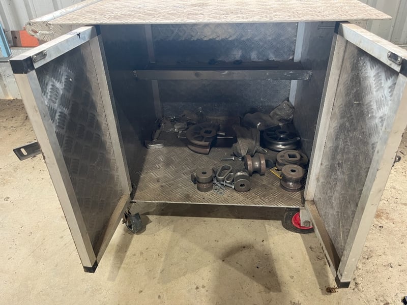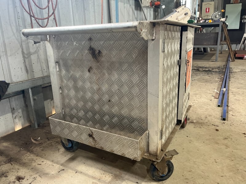 Notes / Extras: aluminium checker plate cabinet, twin door storage, mounted on castor wheels with push handle, explosive signage fitted, includes assorted metal components inside