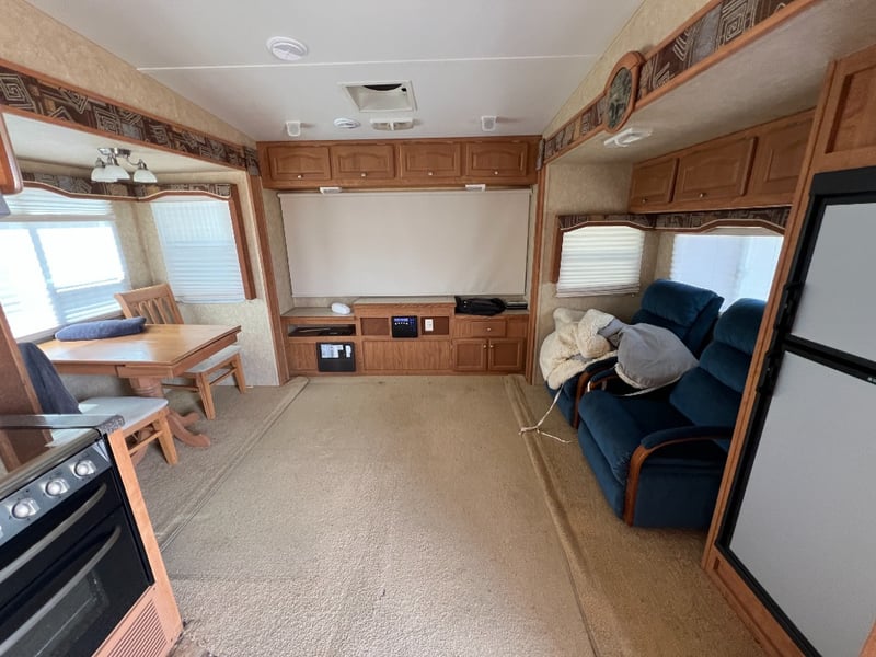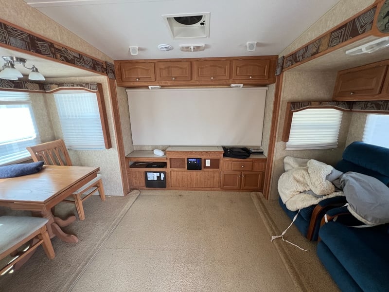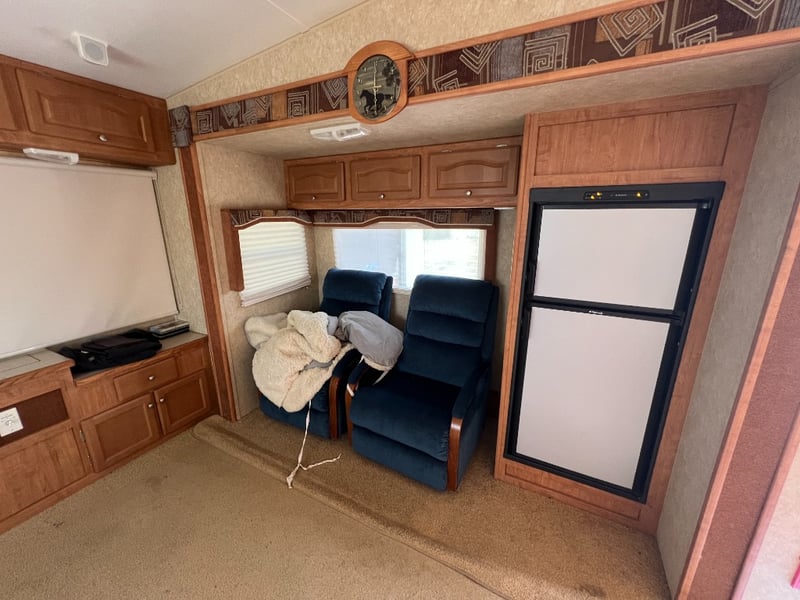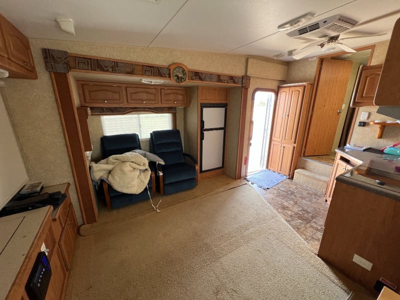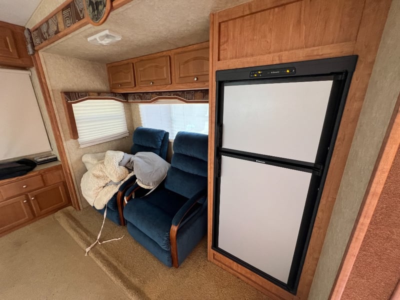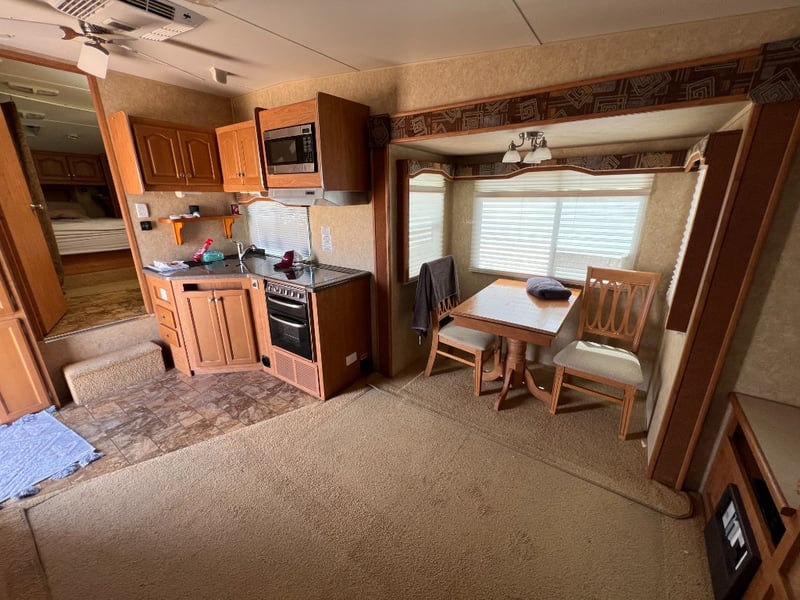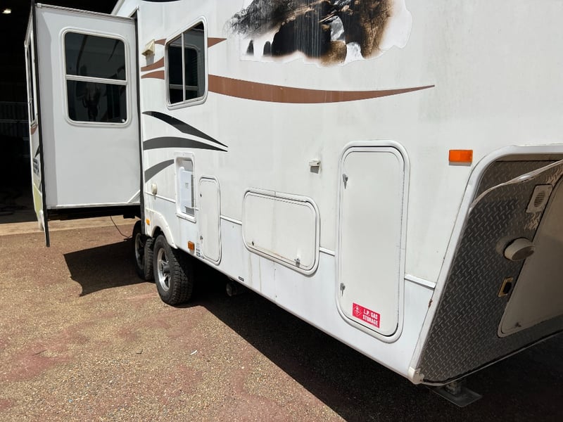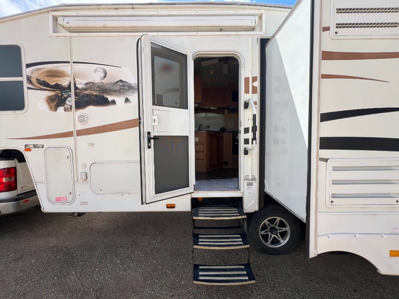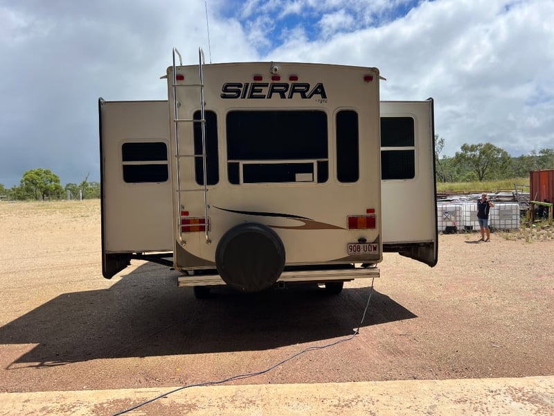 Description: Gooseneck / fifth-wheel coupling that sits over the rear axle, Usually 30–40 ft long, Slide-outs to increase interior space, Tandem axles, Full kitchen, Separate bedroom, Bathroom with full shower, Large lounge with recliners / sofa, air-conditioning and heating.