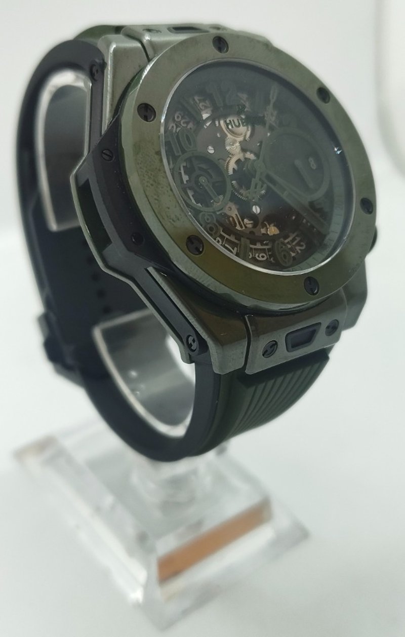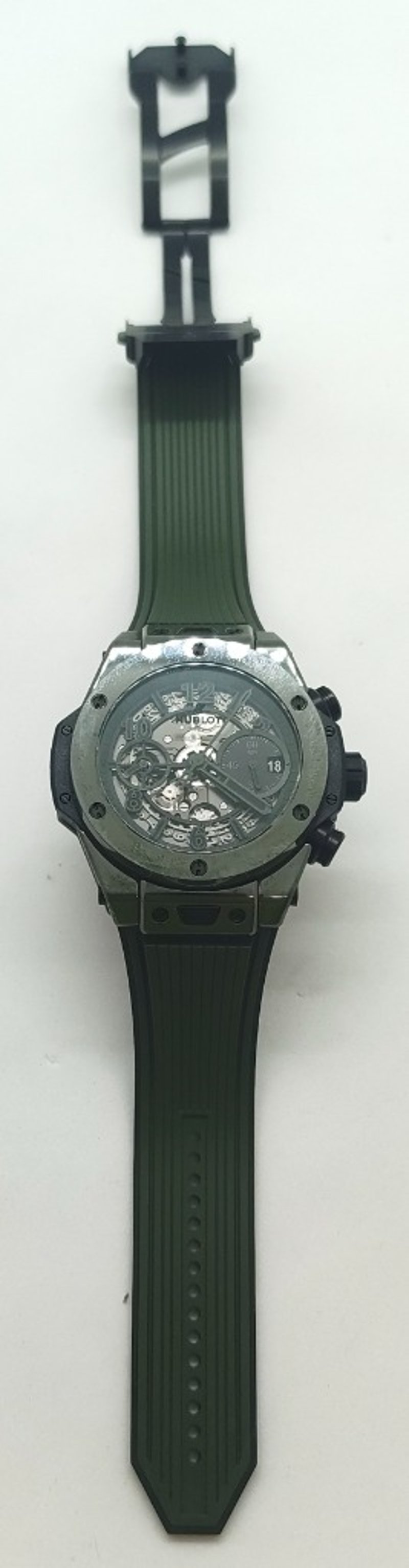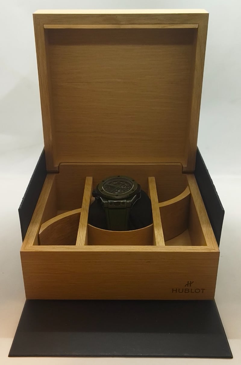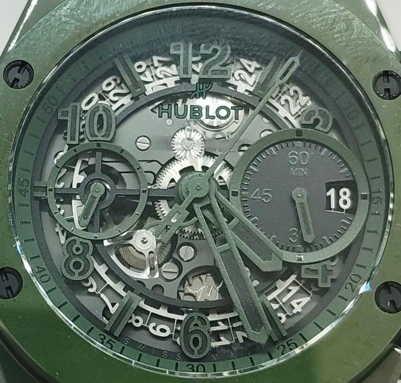 HUBLOT UNICO DARK GREEN CERAMIC 441.GX.5210.RX 2024 REFERENCE NO. 441.GX.5210.RX PRODUCTION YEAR: 2024 DIAL: GREEN SKELTON CASE DESCRIPTION: POLISHED GREEN CERAMIC CASE SIZE: 42MM BRACELET: BLACK AND GREEN STRUCTURED LINED RUBBER MOVEMENT: HUB1280 UNICO MANUFACTURE SELF-WINDING CHRONOGRAPH FLYBACK MOVEMENT WITH COLUMN WHEEL BOX: NOT INCLUDED PAPERS: NOT INCLUDED Condition: Good - Refer To Images Additional Information: Power Reserve: Approx. 72 Hours ACACIA RIDGE 584485+1