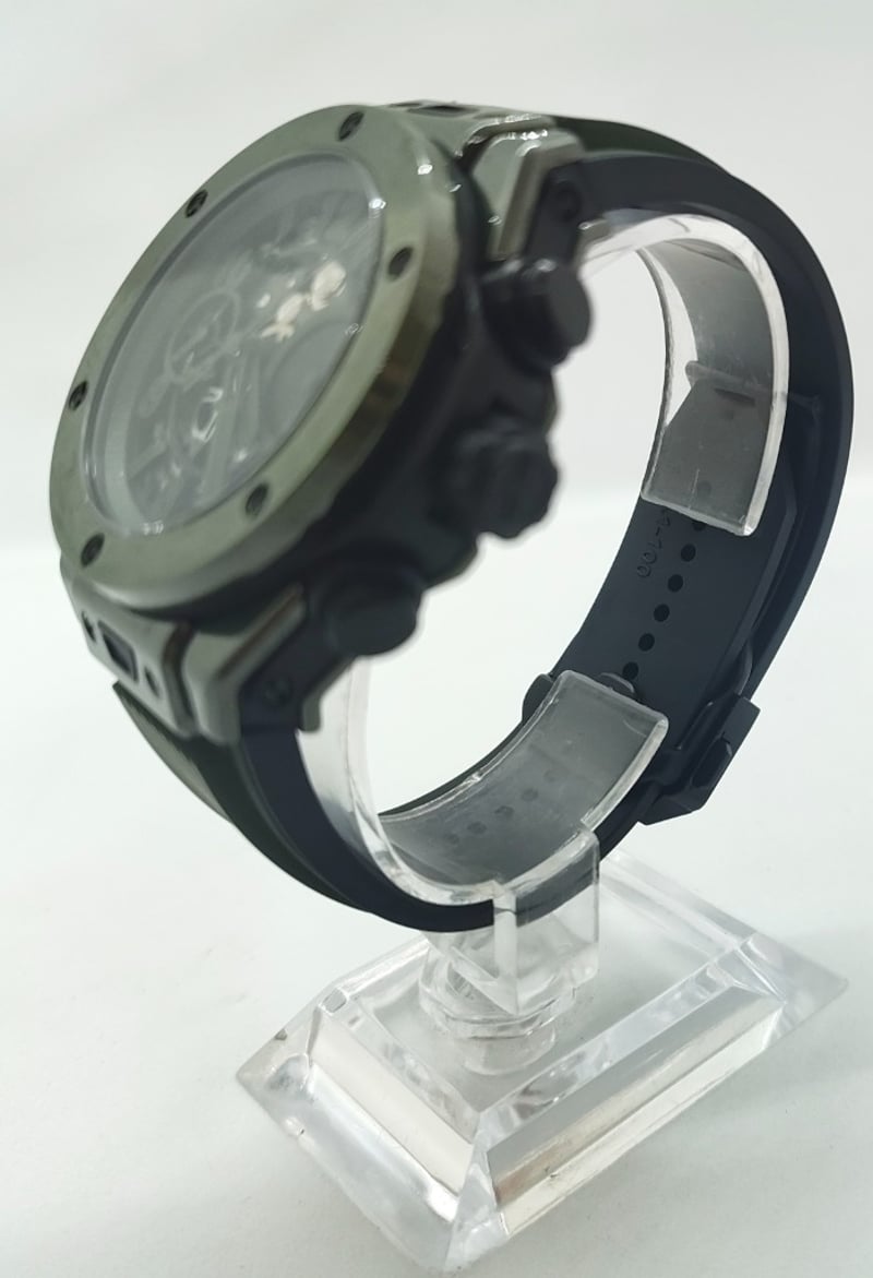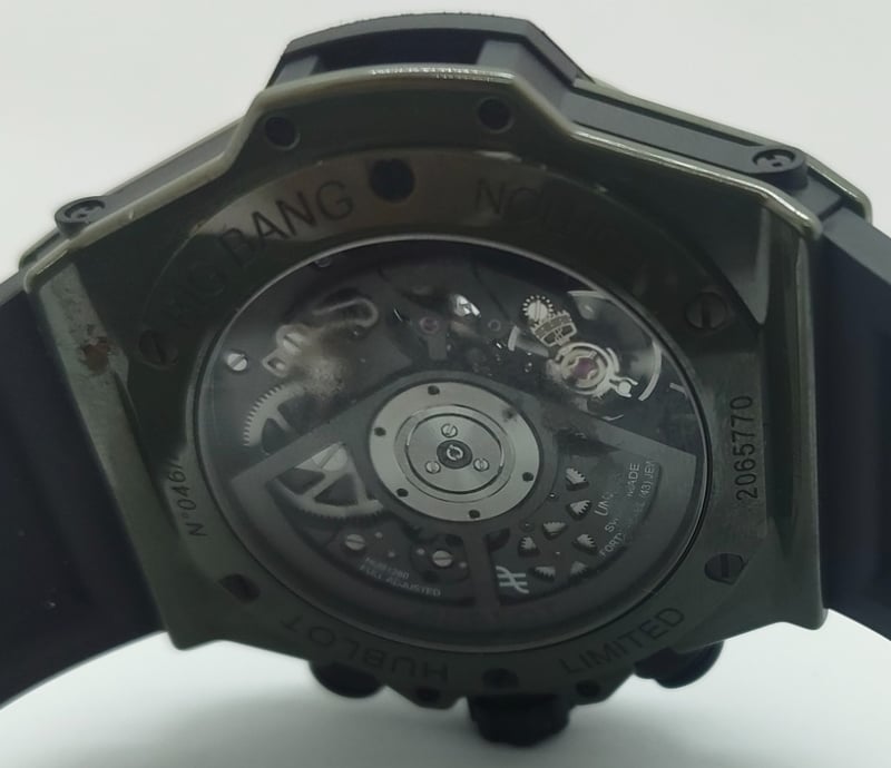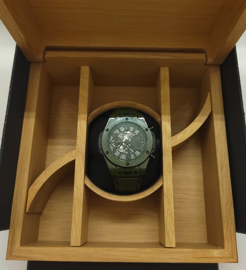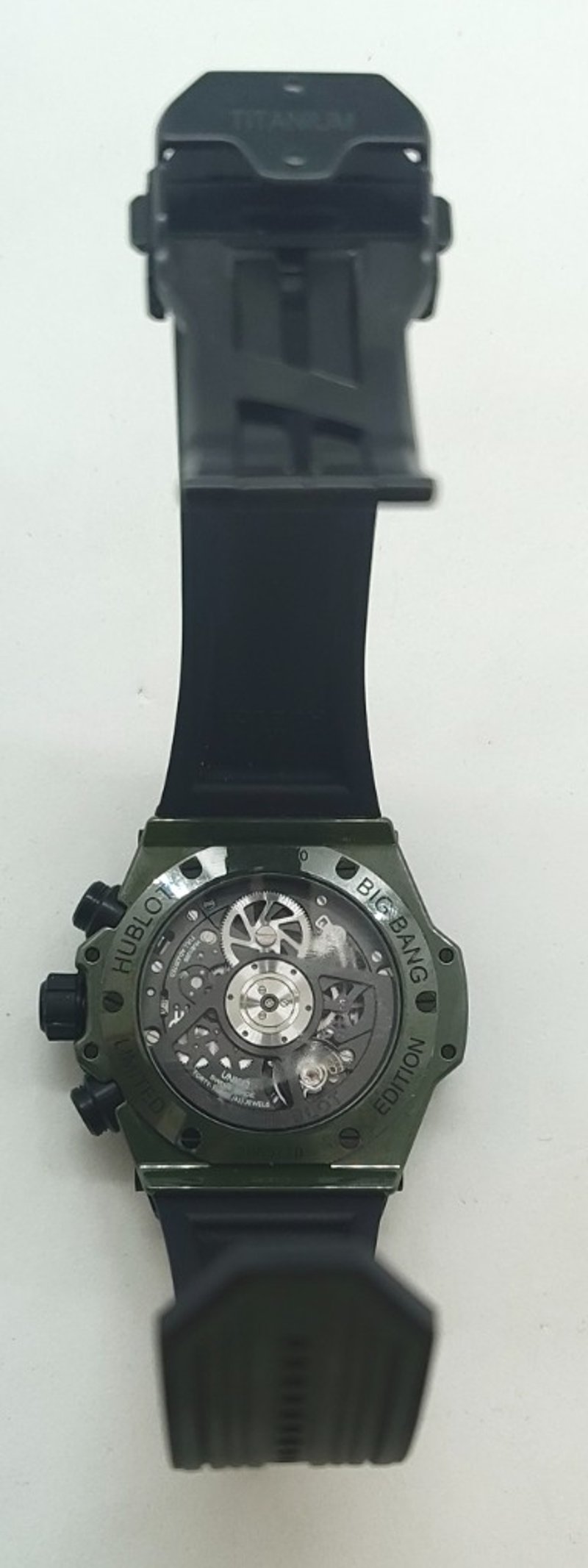 HUBLOT UNICO DARK GREEN CERAMIC 441.GX.5210.RX 2024 REFERENCE NO. 441.GX.5210.RX PRODUCTION YEAR: 2024 DIAL: GREEN SKELTON CASE DESCRIPTION: POLISHED GREEN CERAMIC CASE SIZE: 42MM BRACELET: BLACK AND GREEN STRUCTURED LINED RUBBER MOVEMENT: HUB1280 UNICO MANUFACTURE SELF-WINDING CHRONOGRAPH FLYBACK MOVEMENT WITH COLUMN WHEEL BOX: NOT INCLUDED PAPERS: NOT INCLUDED Condition: Good - Refer To Images Additional Information: Power Reserve: Approx. 72 Hours ACACIA RIDGE 584485+1