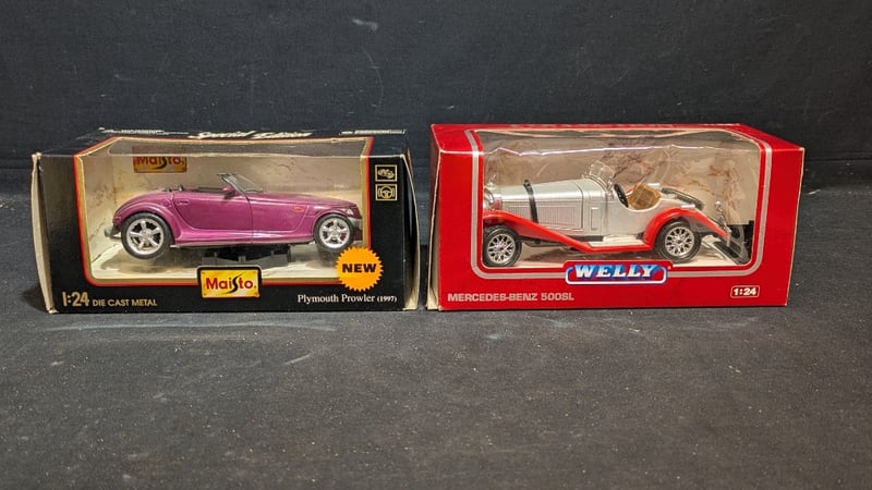 MAISTO 1997 PLYMOUTH PROWLER 1:24 SCALE MODEL CAR AND WELLY MERCEDES BENZ 500SL 1:24 SCALE MODEL CAR