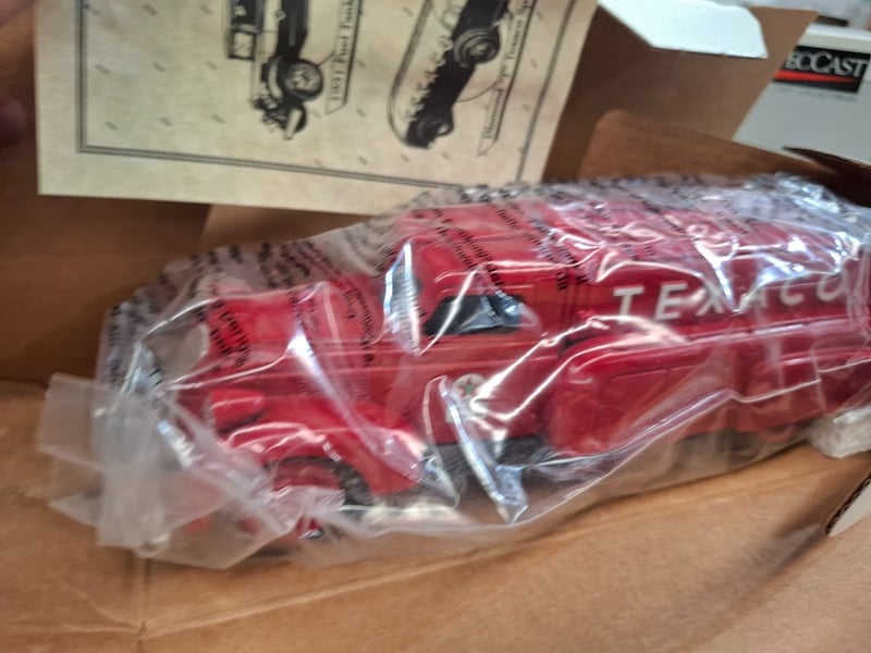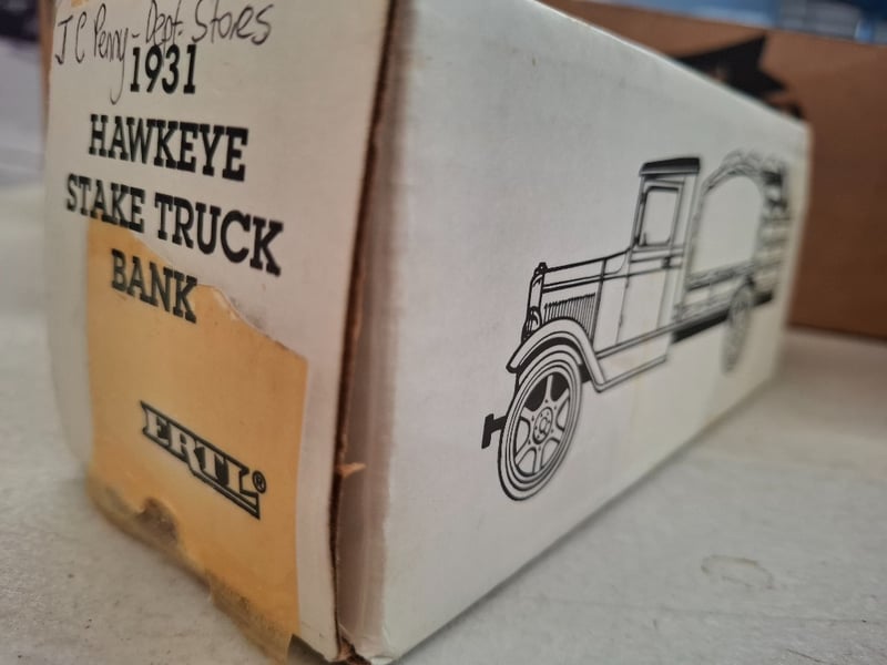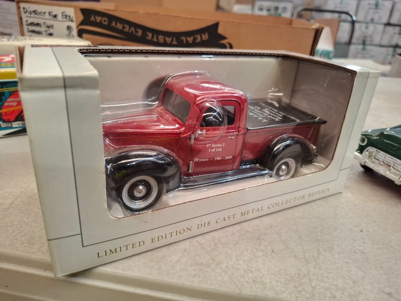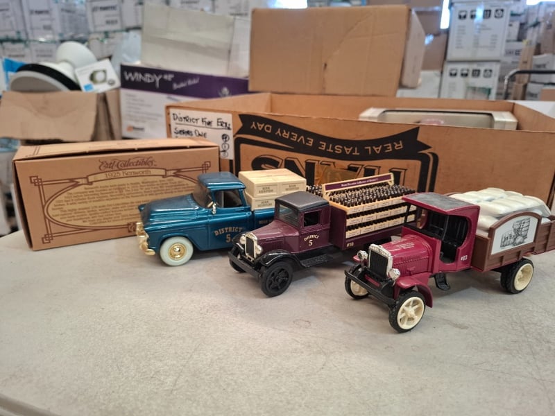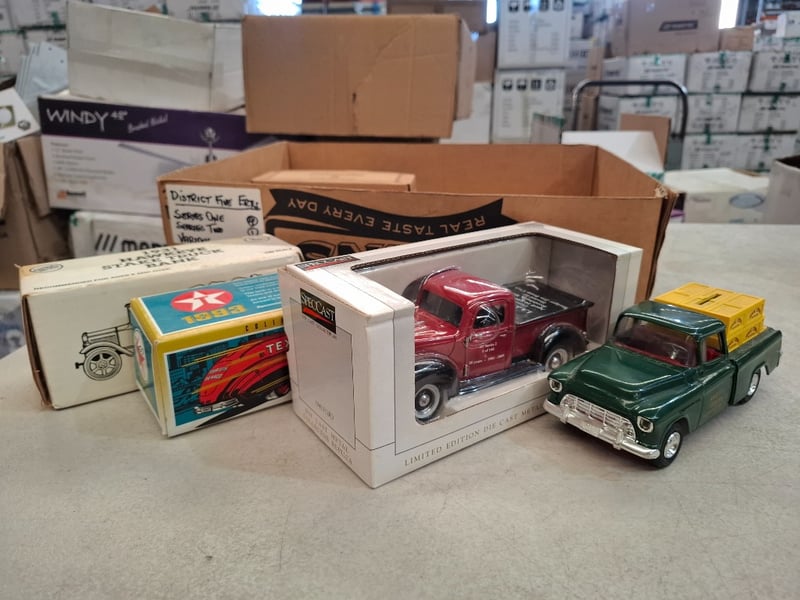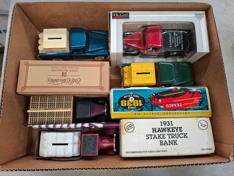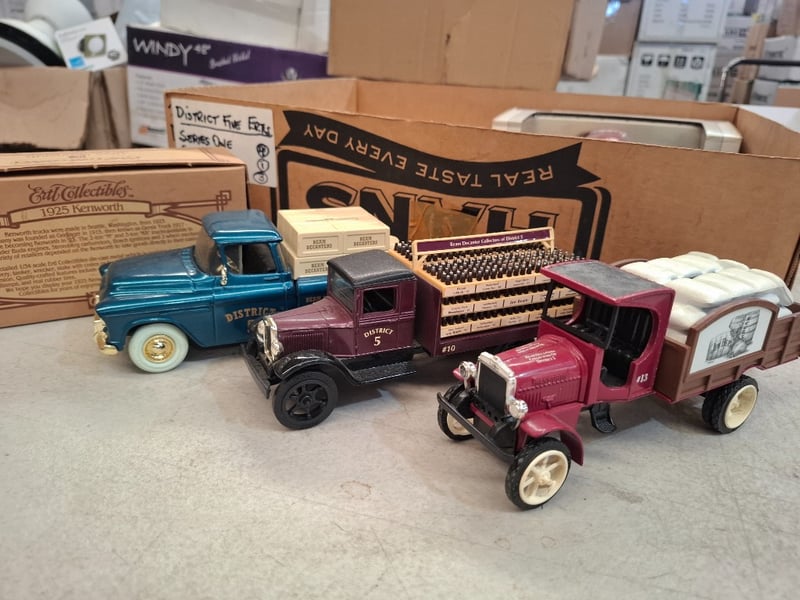 EIGHT MODLES VINTAGE DIE-CAST MODEL VEHICLE COLLECTION - MULTIPLE MANUFACTURERS INCLUDING ERTL, SPECCAST, AND BEADED RESIN TRUCKS Comprehensive Collection Of Vintage Die-Cast Model Vehicles Spanning Multiple Decades And Manufacturers. Includes 1931 Hawkeye Stake Truck Bank (Ertl, 1/25 Scale) In Original Packaging, Speccast Vehicles (Red And Black Models), District Fire Series Models Featuring Detailed Stake Bed Trucks With Working Tailgates, Angelo'S Liquors Promotional Truck (Green, Wilmington Il), Limited Edition Metal Collector Replicas With Authentic Weathering, Texas-Branded Models In Original Plastic Wrap, And Assort Condition: Fair - Refer To Images 584482+8