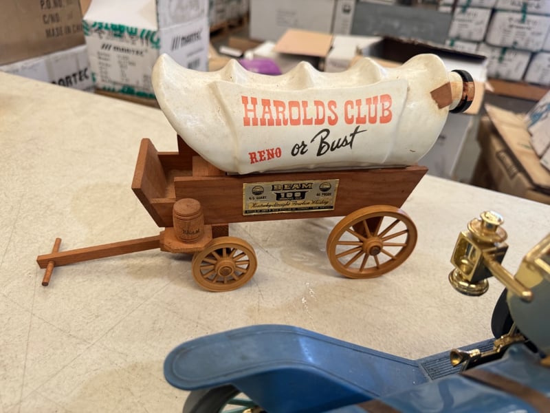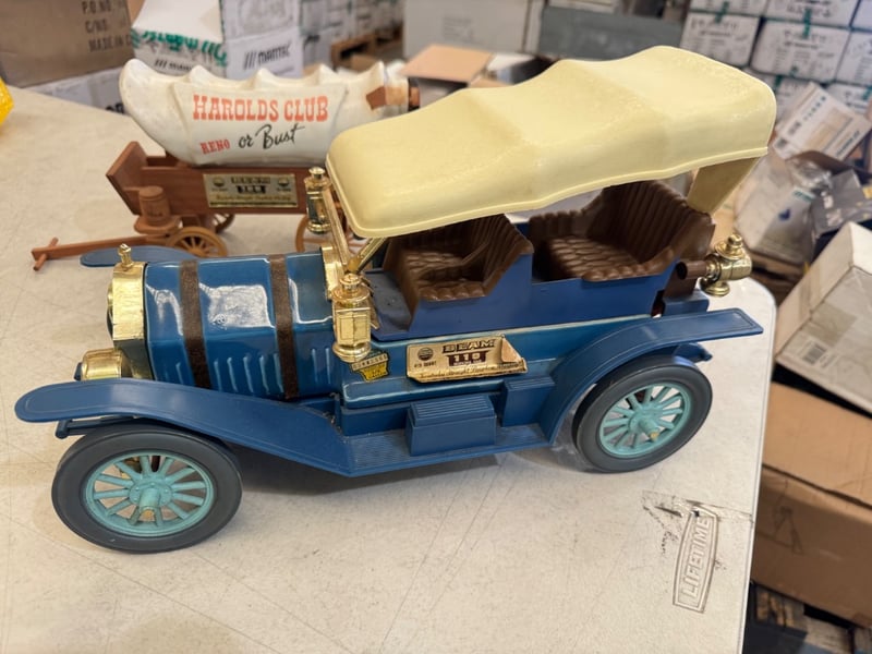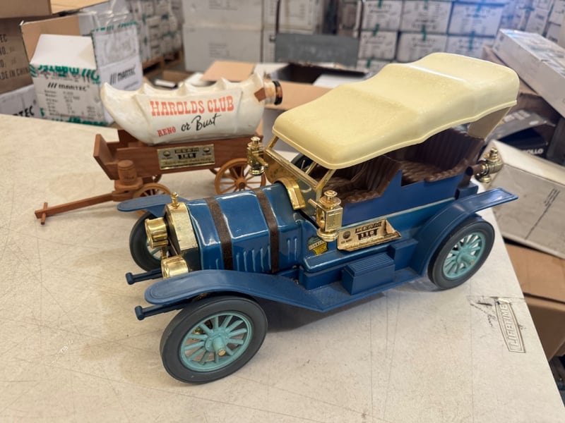 VINTAGE BEAM TAXI DIE-CAST MODEL CAR WITH CREAM CANVAS CANOPY AND WOODEN WAGON Item Size: Height: 12cm, Width: 28cm, Depth: 12cm, Weight: 5Kg Blue Die-Cast Beam Taxi Automobile Featuring Articulated Cream Canvas Convertible Canopy, Brass Fittings, Pale Blue Spoked Wheels, Accompanied By Wooden Pull-Wagon With Ceramic "Harolds Club Reno Or Bust" Advertising Vessel. Circa 1960S-1970S Promotional Collectibles. Condition: Good - Refer To Images 584482+9