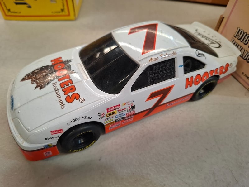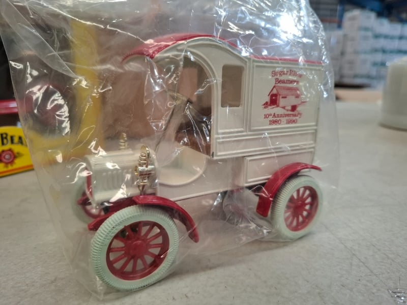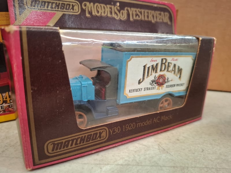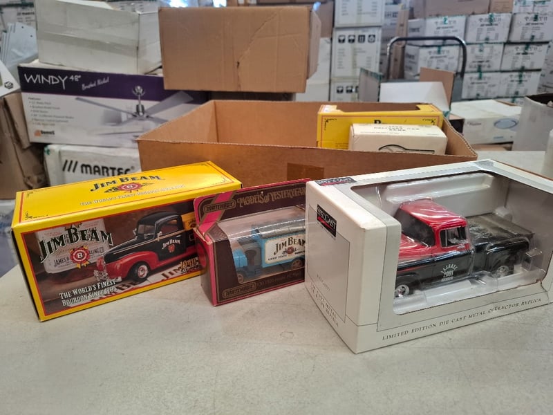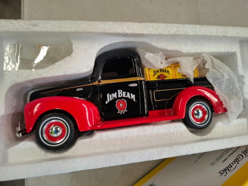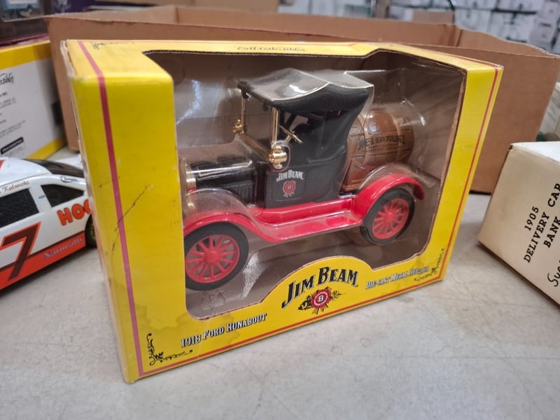 Comprehensive Collection Of Die-Cast Scale Model Vehicles Featuring Multiple Jim Beam Kentucky Straight Bourbon Whiskey Branded Promotional Trucks Spanning Several Decades, Including 1918 Ford Runabout, Vintage Matchbox Models Of Yesteryear Series Vehicles, Modern Racing Stock Car, 1905 Delivery Car Bank, Ertl Limited Edition Replicas, And Specialty Commemorative Models. Collection Displays Red And Black Color Schemes With Authentic Branding, Includes Original Packaging Boxes In Yellow, Cream, A