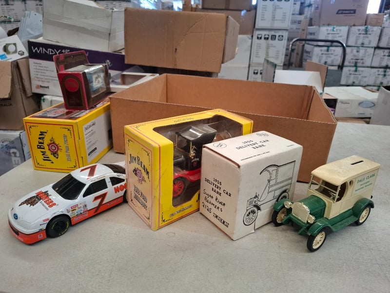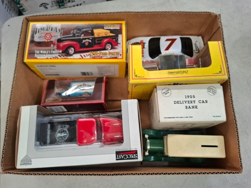 SEVEN MODLES OF VINTAGE JIM BEAM WHISKEY BRANDED DIE-CAST MODEL TRUCKS AND CLASSIC AUTOMOBILES COLLECTION