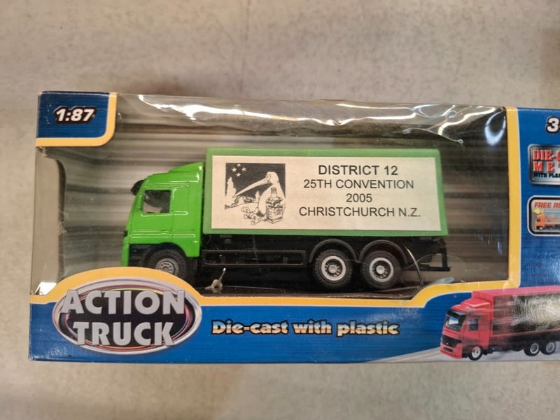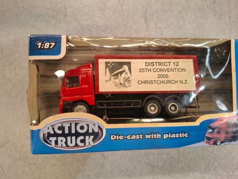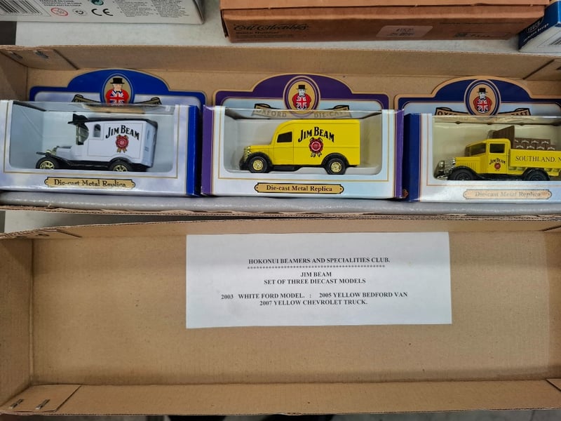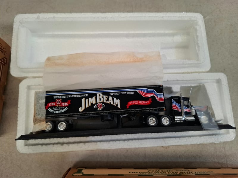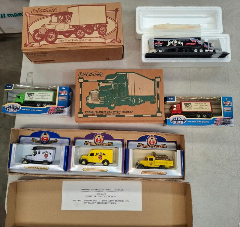 Comprehensive Collection Of Die-Cast Vehicle Replicas Featuring Vintage Ertl Collectibles And Oxford Models. Includes 1918 Ford Cab And Trailer (Metal Replica, Original Packaging), Freightliner Cab With Trailer (1/64 Scale Metal Die-Cast), Jim Beam Promotional Semi-Truck (200 Years Anniversary Edition), District 12 Convention 2005 Christchurch New Zealand Trucks In Red And Green Variants (Action Truck Series With Plastic Components,