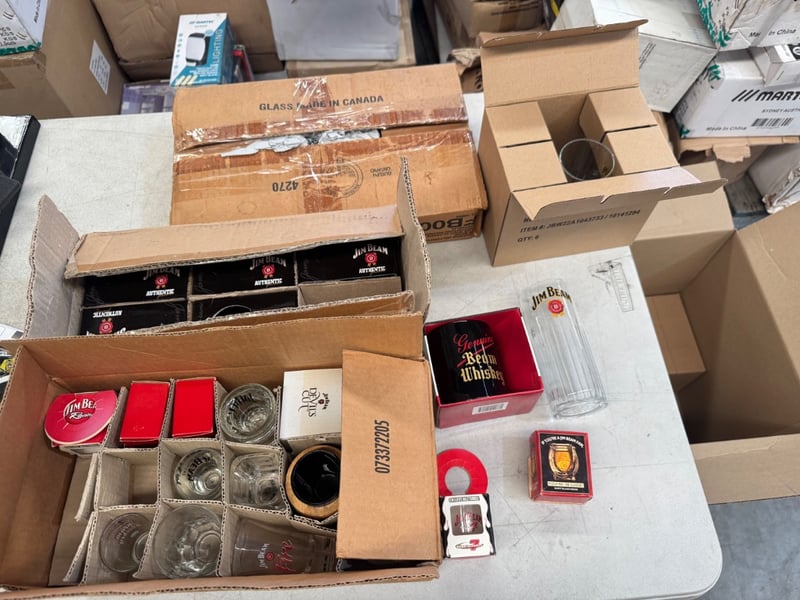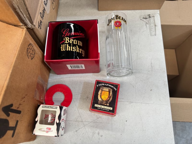 Comprehensive Jim Beam Whiskey Collectible Set Featuring Genuine Beam Branded Glassware, Including Tall Glasses With Embossed Logo, Red Fabric Coasters, Decorative Ceramic Pieces, Promotional Drinking Vessels, And Original Red Presentation Boxes. Collection Includes Multiple Drinking Glasses With Varying Heights And Designs, Authentic Jim Beam Branding Elements, Protective Packaging Materials, And Vintage Promotional Merchandise Spanning Multiple Decades Of Collectible Memorabilia.