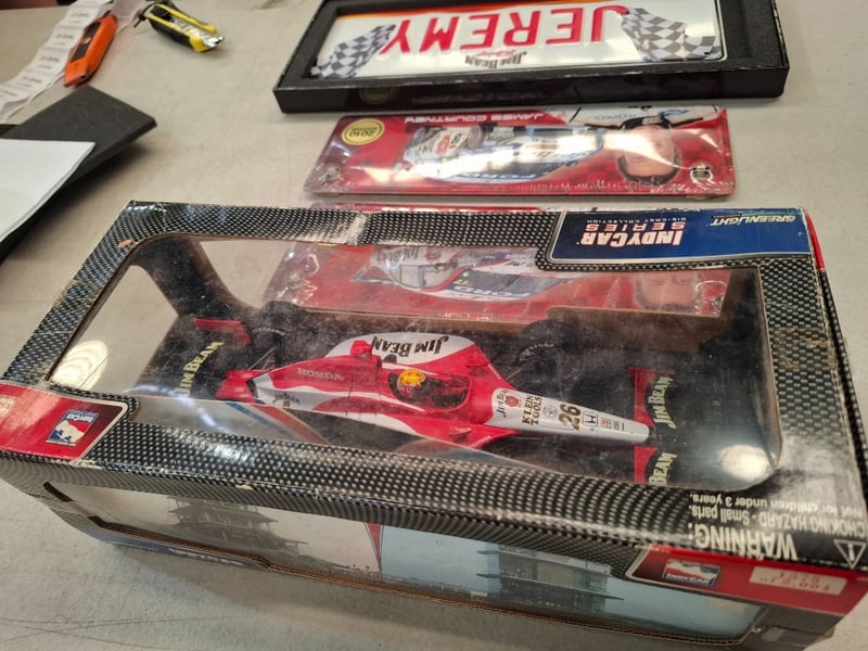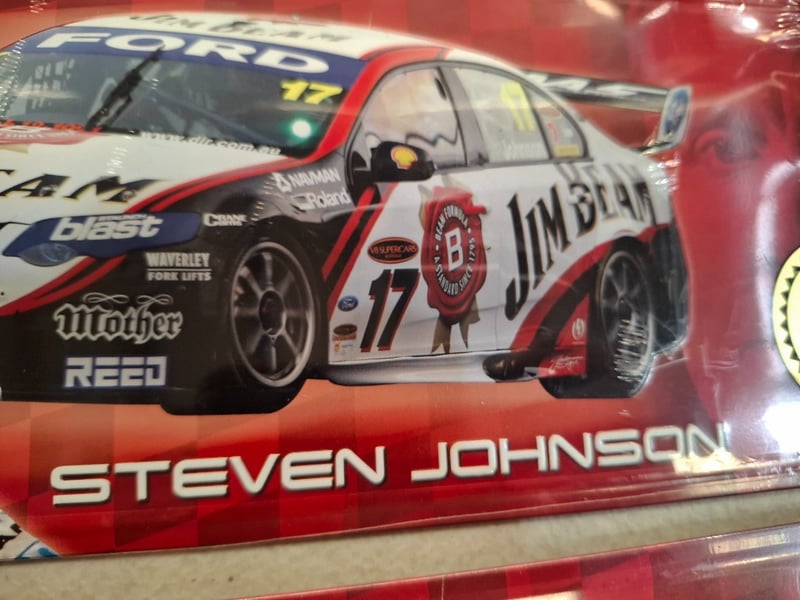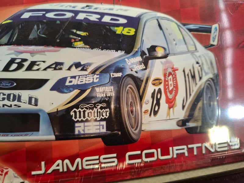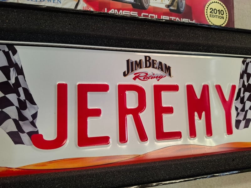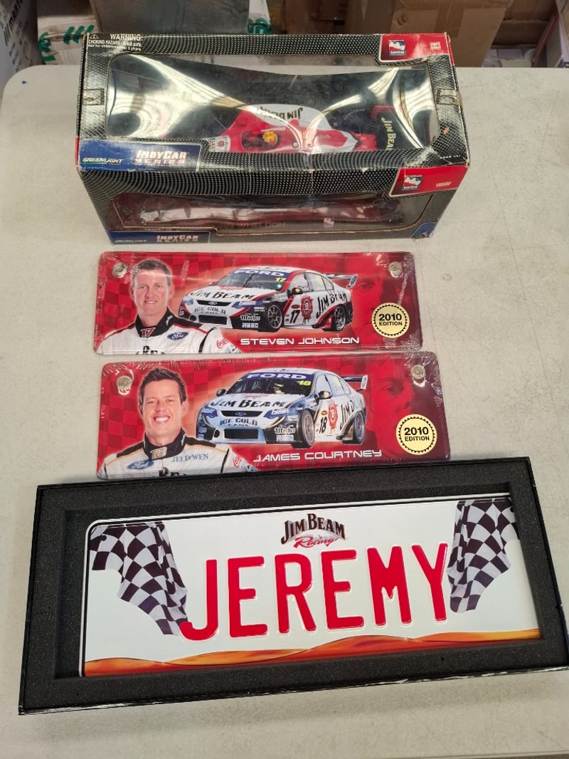 Comprehensive Jim Beam Racing Memorabilia Collection Featuring Die-Cast Model Racing Cars, Official Driver Portraits, And Framed Personalized License Plate. Includes 2010 Edition Steven Johnson Ford #17 Jim Beam Liveried Sedan And James Courtney Ford #18 Jim Beam Blue Blast Vehicle With Detailed Firestone Tyres, Alongside Framed "Jeremy" Jim Beam Racing Nameplate With Checkered Flag Motif And Black Display Frame.