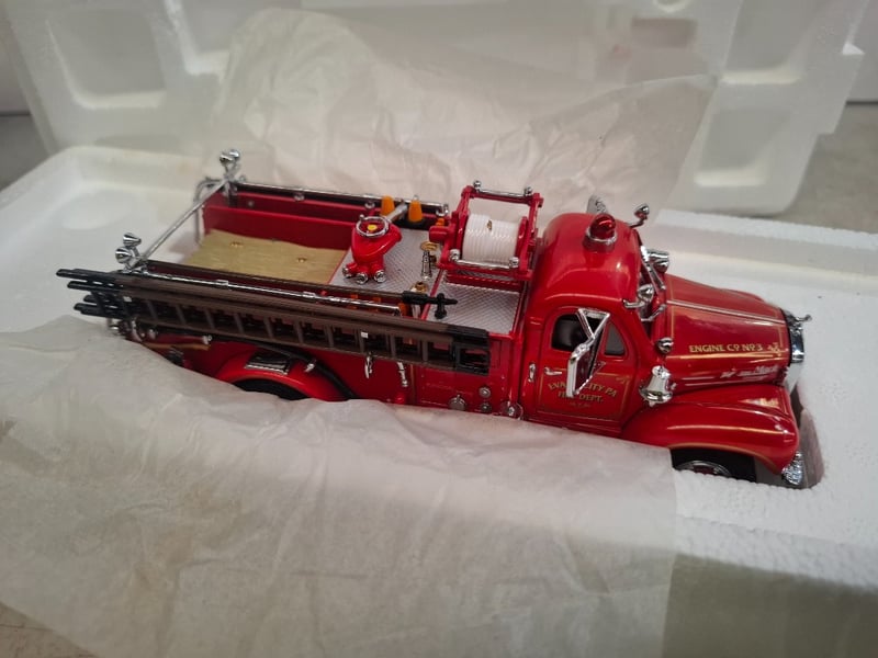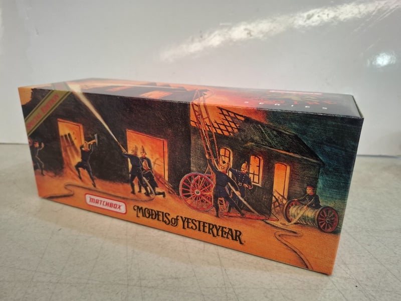 Vintage Matchbox Models Of Yesteryear Die-Cast Fire Engine Featuring A 1956 Mack B-95 Large Configuration. Red Painted Metal Construction With Detailed Chrome Fittings, Functional Hose Reel Mechanism, And Authentic Engine Co No 3 Livery. Original Box Presentation Showing Period-Appropriate Western Saloon Imagery. Excellent Restoration Of Classic Emergency Service Vehicle With Meticulous Paint Application And Mechanical Components Intact.