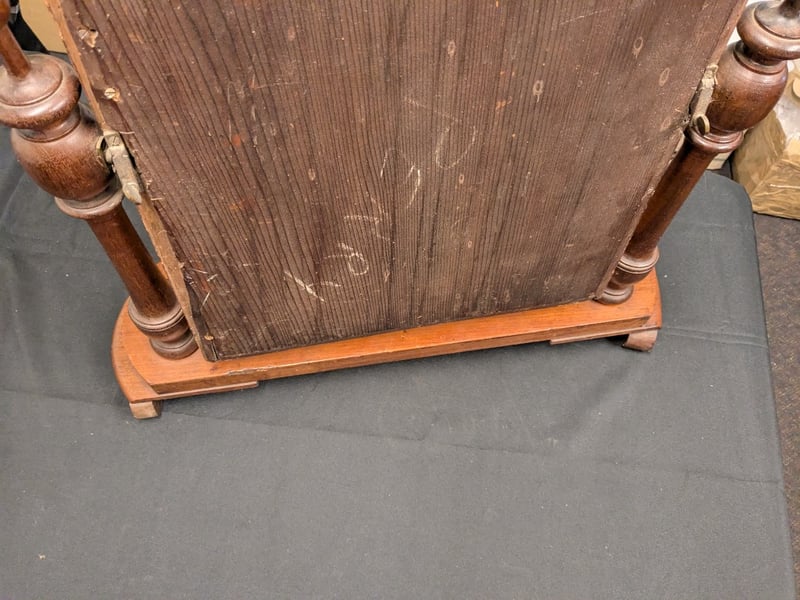 VICTORIAN CARVED TIMBER SHAVING MIRROR WITH TURNED SUPPORTS