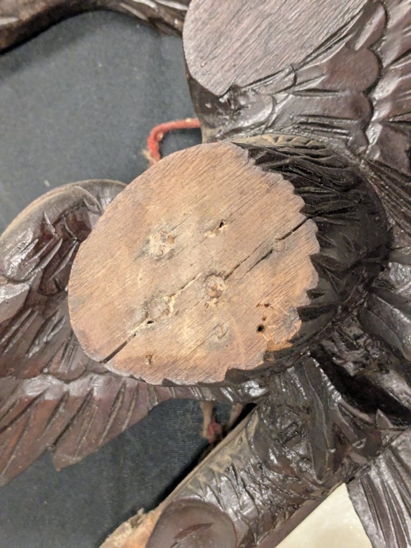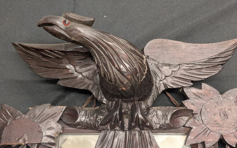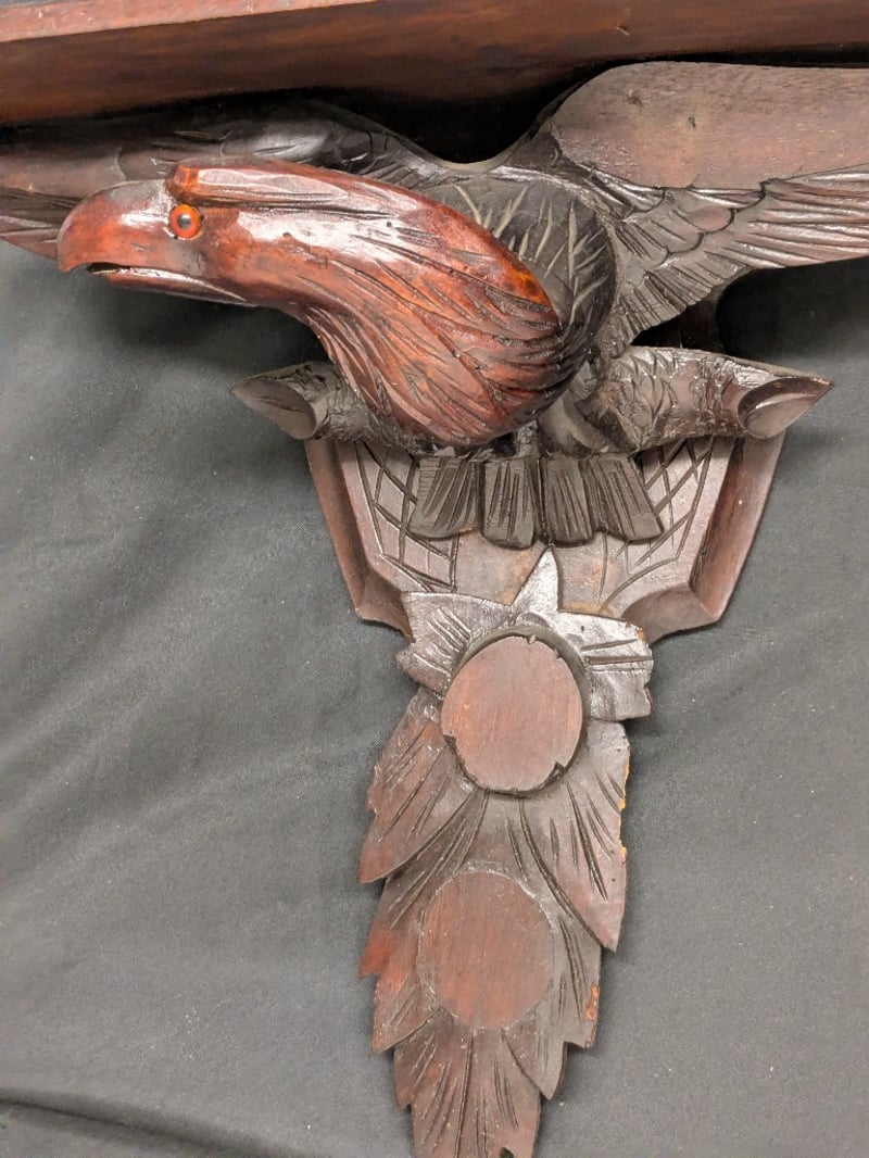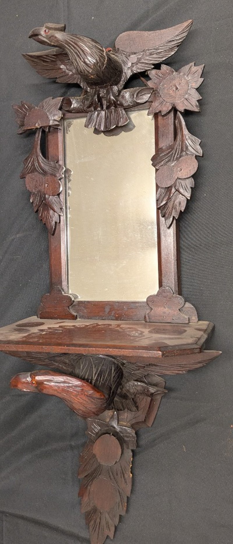 CARVED WOODEN EAGLE MIRROR WITH SHELF AND ORNAMENTAL FINIALS