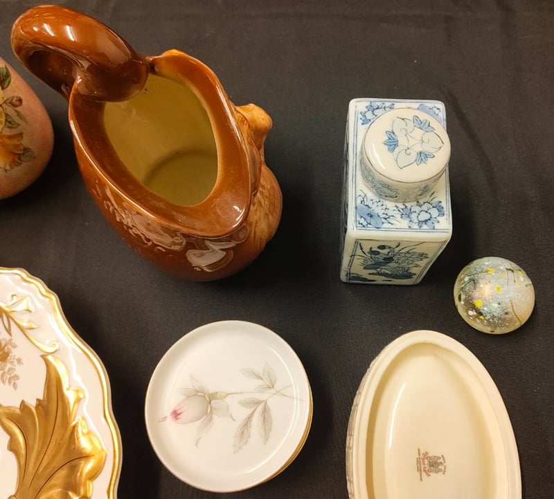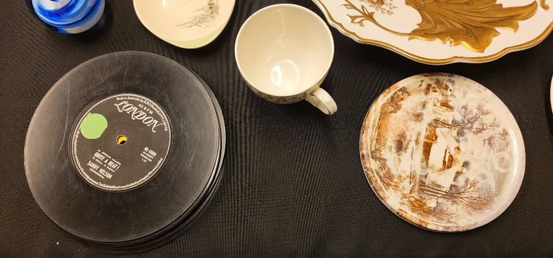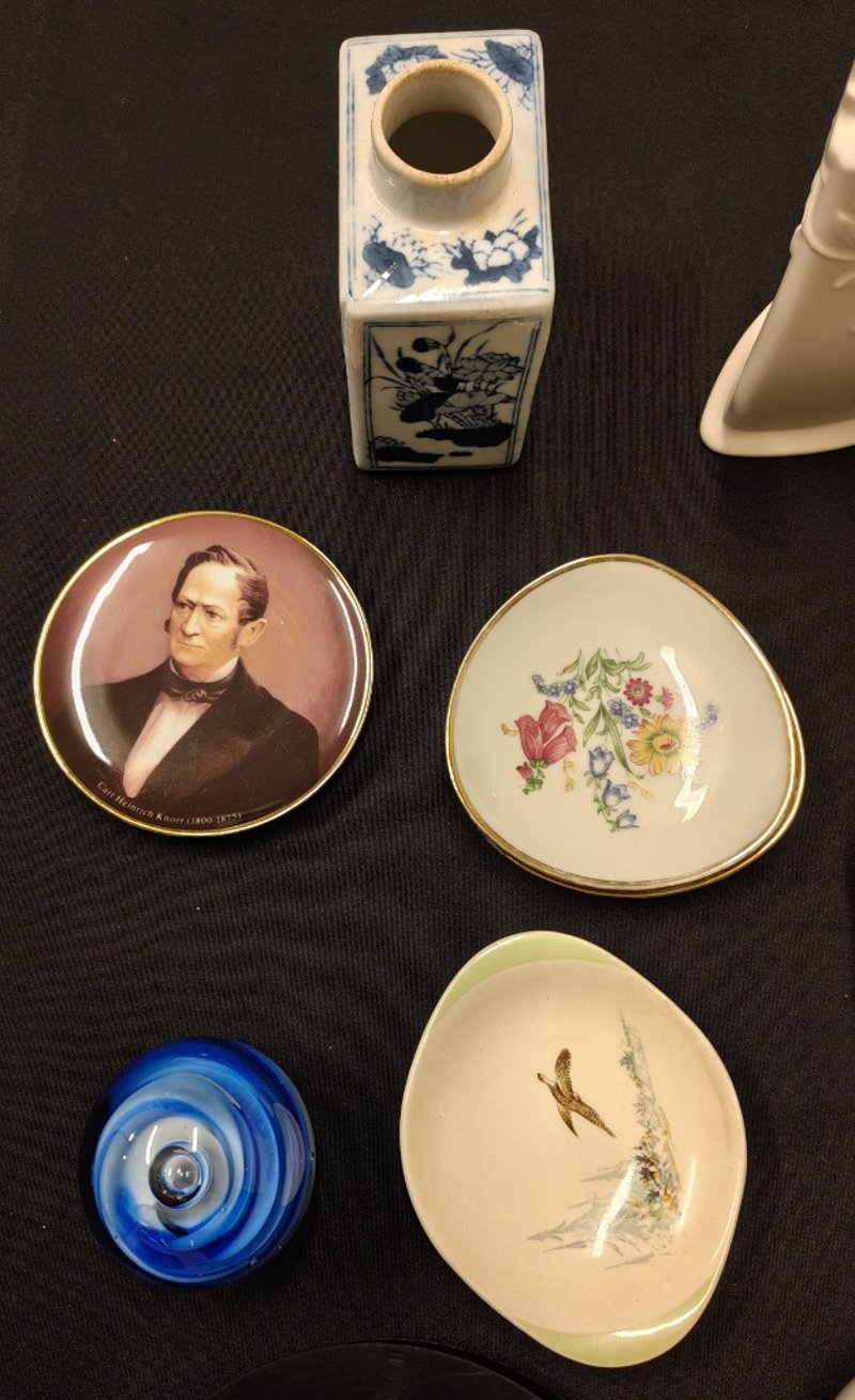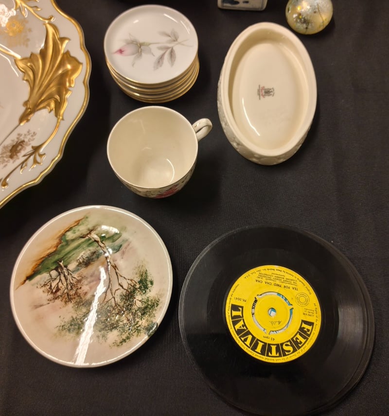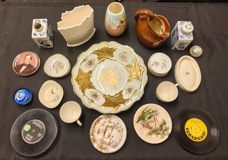 COLLECTION OF GLASSWARE AND ANTIQUES, INCLUDING PLATES, JUGS, VINYLS, AND MORE