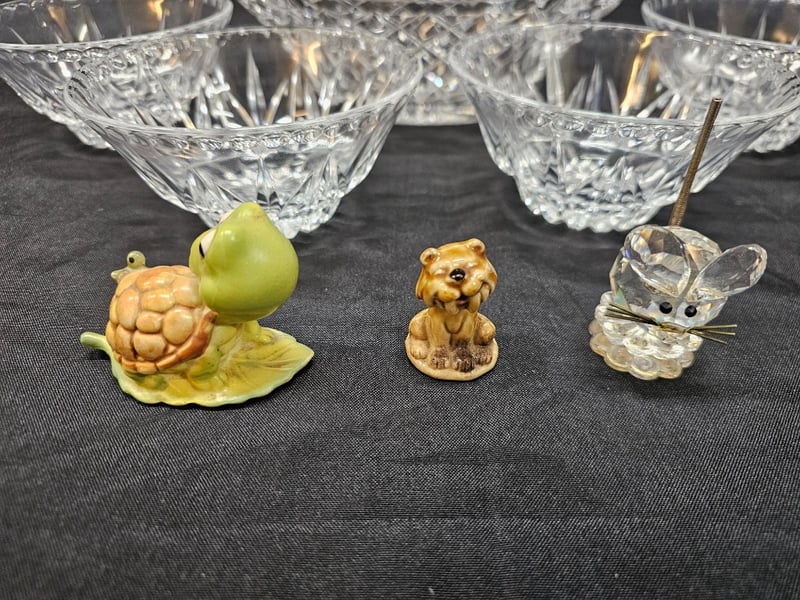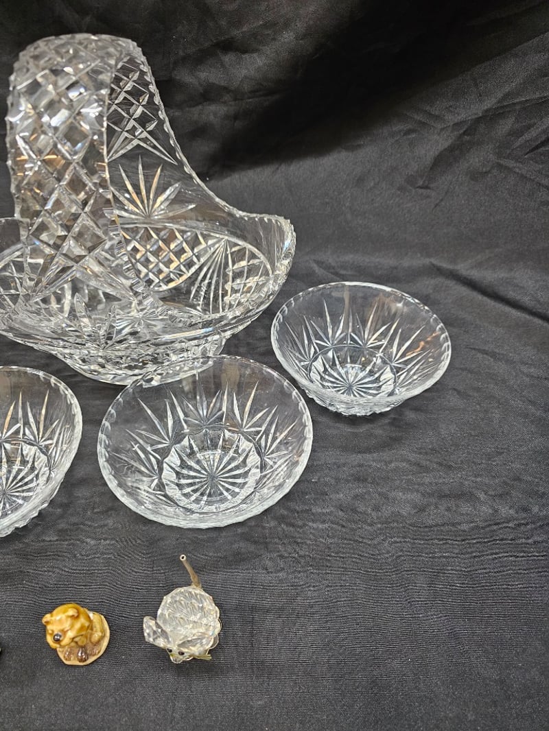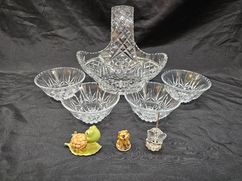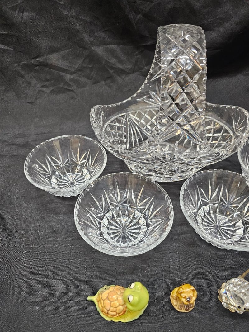 BASKET WITH FOUR BOWLS AND SMALL FIGURINES