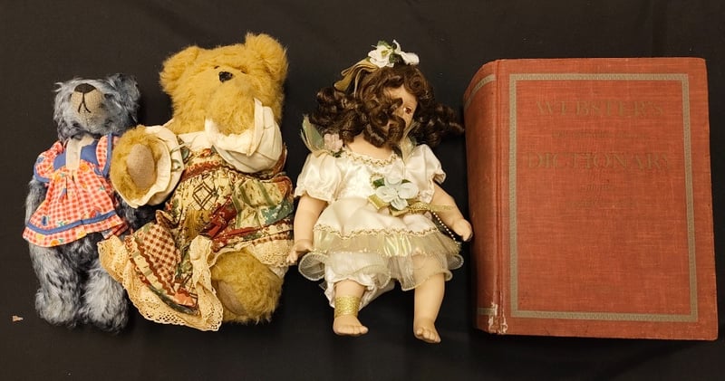 COLLECTION OF ANTIQUE COLLECTABLES, INCLUDING TEDDY BEARS, DOLL AND DICTIONARY