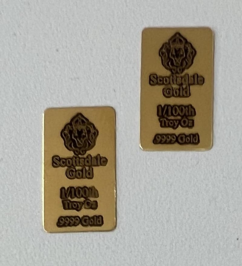 1/100 OUNCE SCOTTDALE GOLD BAR X 2 X 2 & 1 GRAM GERMANIA MINT SILVER BAR X 2