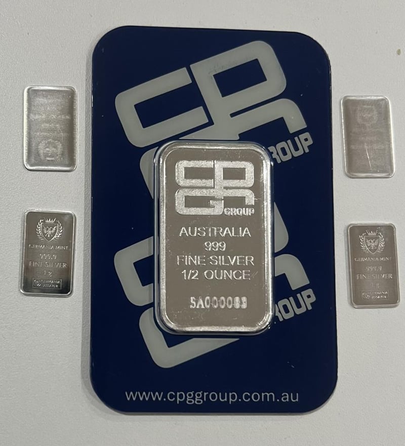 HALF OUNCE CPG SILVER HALF CERTIFIED SEALED BAR AND 4 X GERMANIA MINT 1 GRAM SILVER BARS
