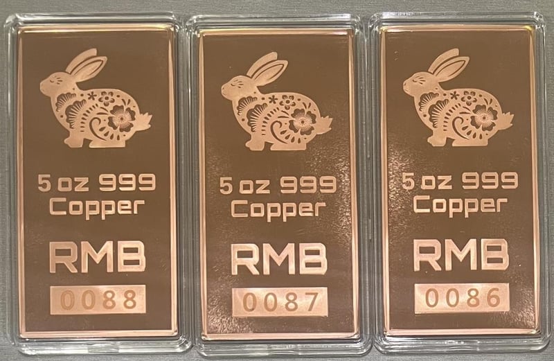 5 OZ 999 COPPER BAR RABBIT BY RMB BULLION X 3 INVESTOR QUALITY GRADE