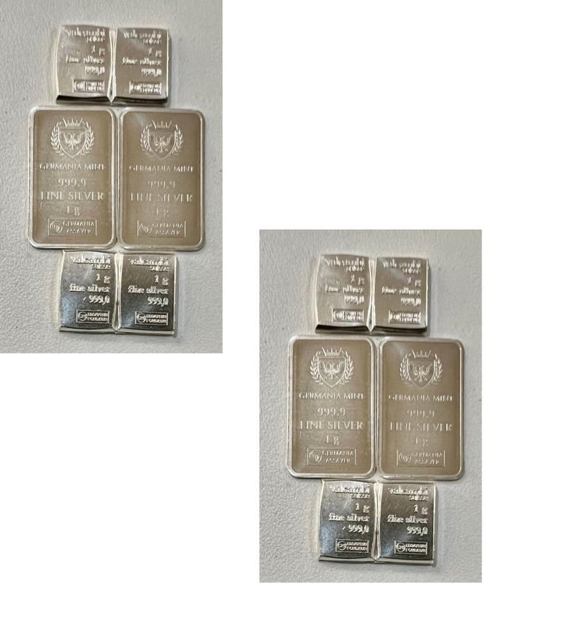 1 GRAM VALCUMBI SILVER BARS X 8 & 1 GRAM GERMANIA MINT BAR X 4 311179+28